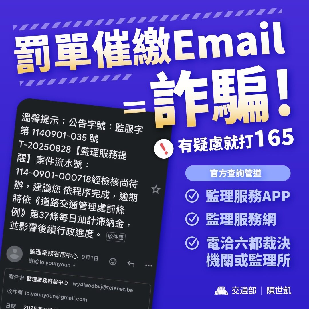 2025-09-05 監理站不會寄送罰單催繳email 注意!監理站不會寄送 #罰單催繳 email。 只要收到這類信件,就是詐騙!請分享給更多人知道! 資料來源:https://www.threads.com/@chanskym/post/DOLRGRQES3E?xmt=AQF0Cum6WdzSi3QLWfg6v_9qEnNWcdT39U54Uz_qWzhmSw 交通部