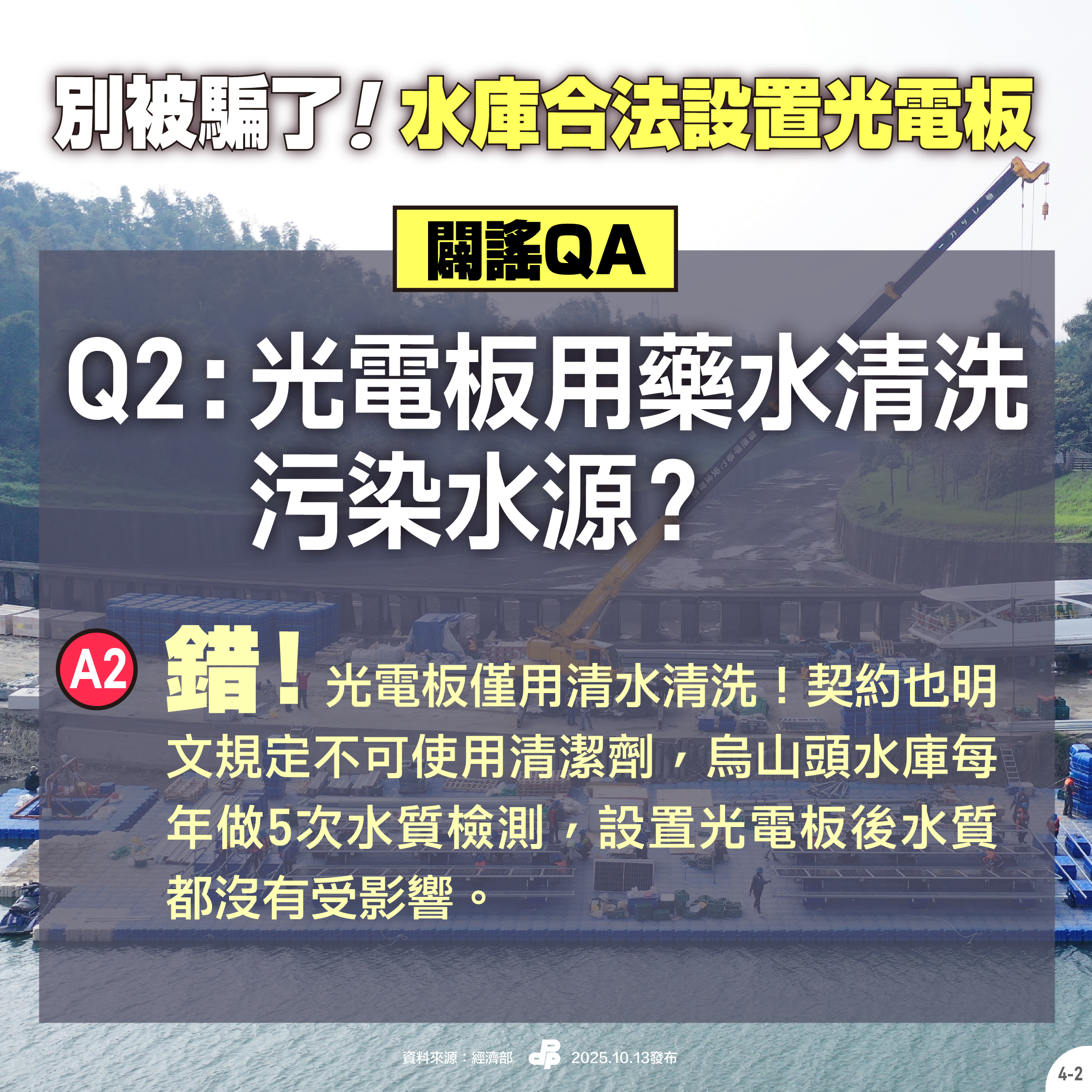 錯!清洗只用清水。契約明文規定不得使用清潔劑,而且烏山頭水庫每年進行5次水質檢測,設置光電板後水質狀況都維持良好。