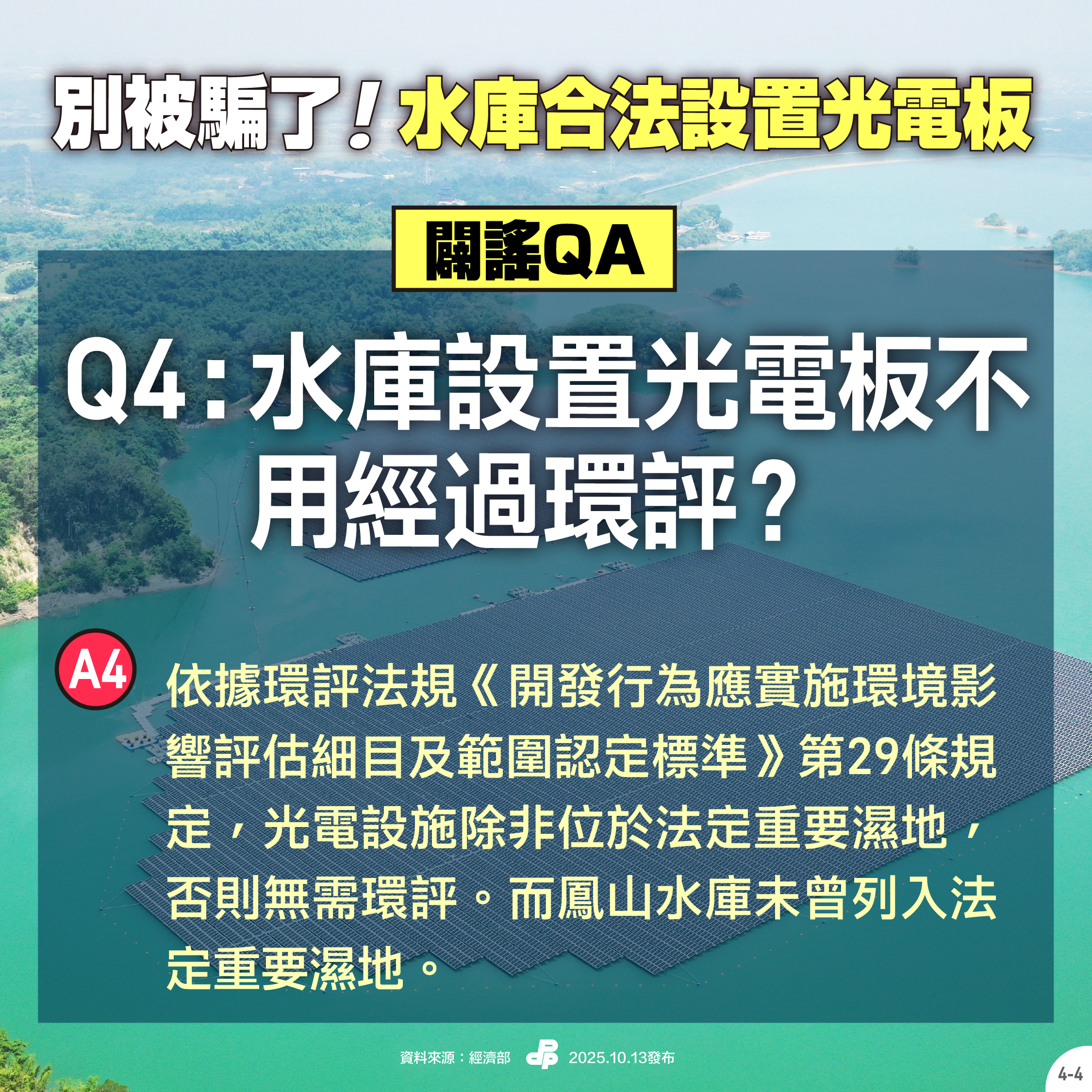 根據《環評法》與《開發行為應實施環境影響評估細目及範圍認定標準》第29條規定,只有設在「法定重要濕地」的光電設施才需要環評。而鳳山水庫不在法定重要濕地名單內,因此依法免環評。