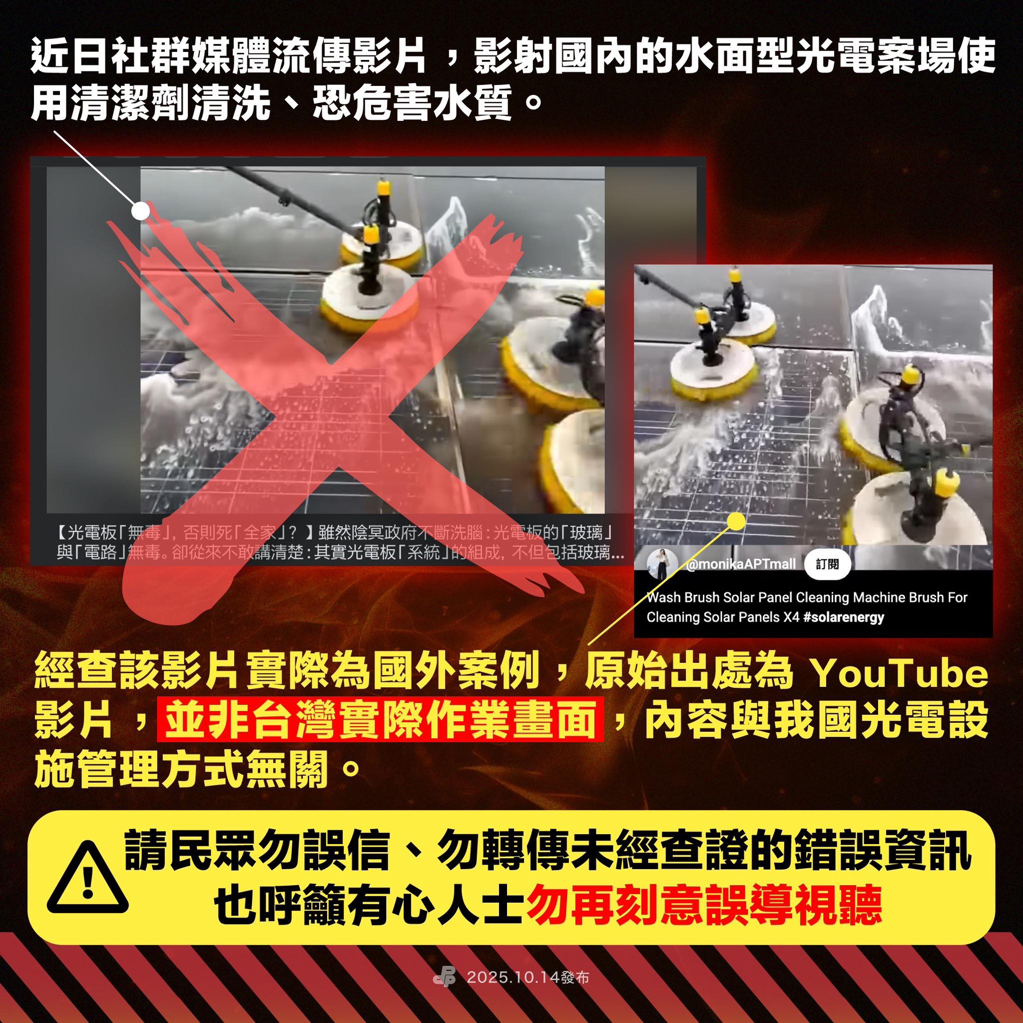 這幾天流傳的影片「影射國內水面型光電案場使用『清潔劑』清洗,恐危害水質」,經過查核,實際上原始出處是國外的YouTube影片(頻道名稱:monika-APT mall),並不是台灣實際作業畫面,內容當然也就和台灣的光電設施管理、清潔「沒有任何關連」。