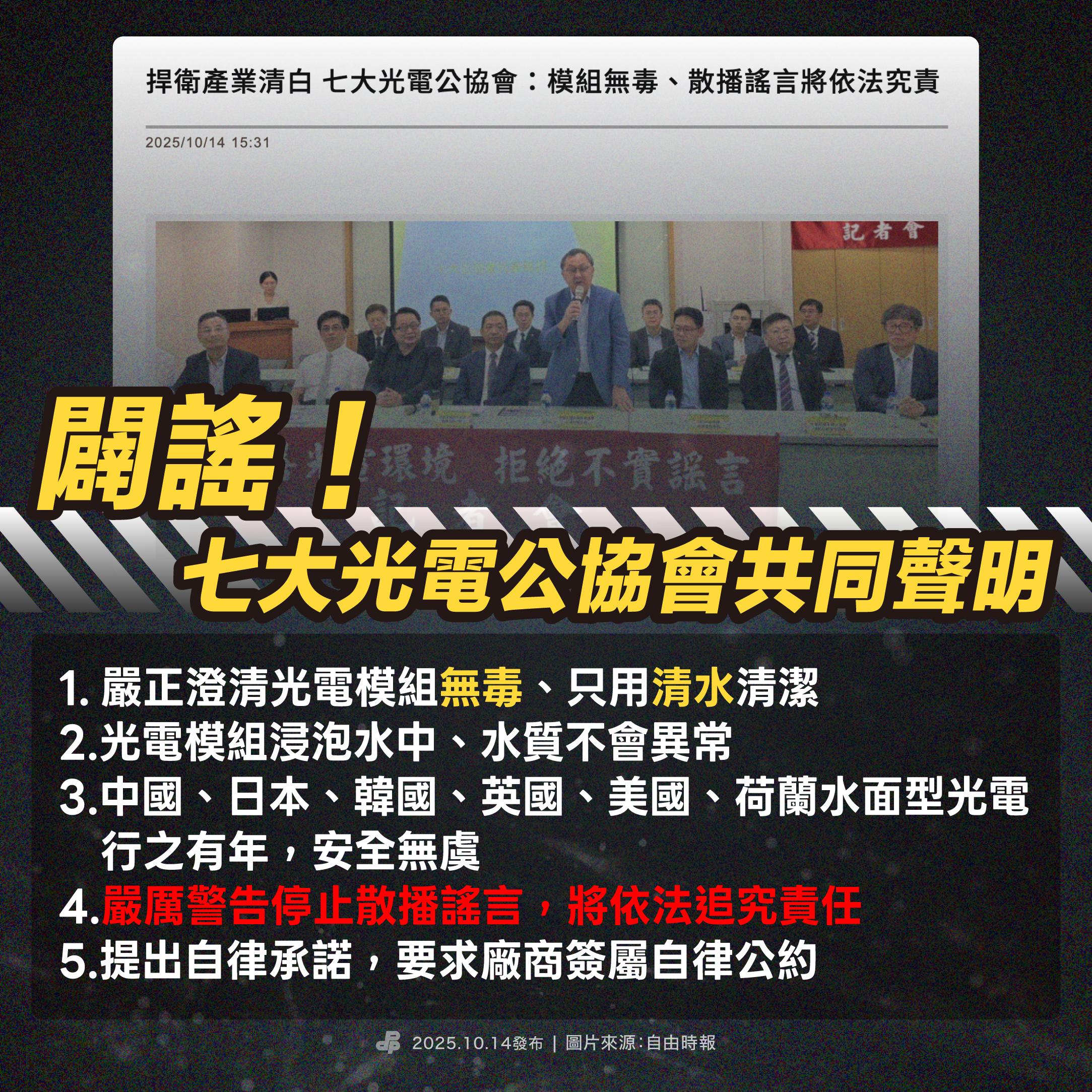 七大光電公協會也嚴正呼籲,擁有公眾影響力的網紅、意見領袖及媒體平台,應負起更高的社會責任與查證義務,避免散播未經查證的訊息,以免觸犯《社會秩序維護法》等相關規定,為了保障產業權益,未來如有針對特定對象刻意散布謠言並造成產業實質損害,各公協會及會員業者將立即啟動蒐證程序,依循法律途徑,嚴正追究散播者的《刑法》及《民法》相關責任,絕不寬貸;同時,綠色能源發展關乎台灣在全球供應鏈的採購信心及國家長遠發展,不容許被惡意謠言所阻礙。