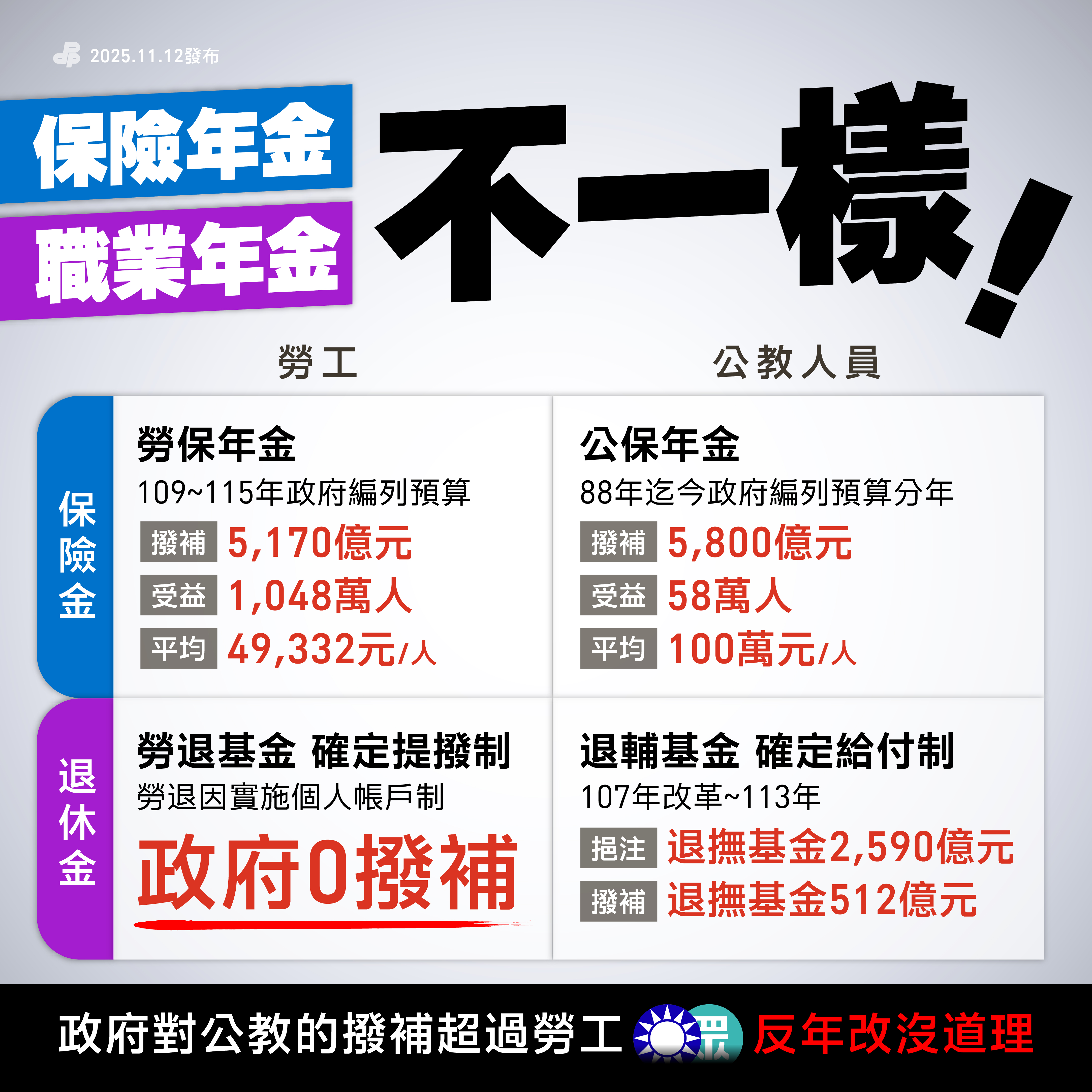 整體而言,公教人員的制度因政府長期撥補而相對穩定,勞工的退休保障則仍需時間累積與制度完善,兩者結構完全不同,不能單純以繳費與給付比例來直接比較。