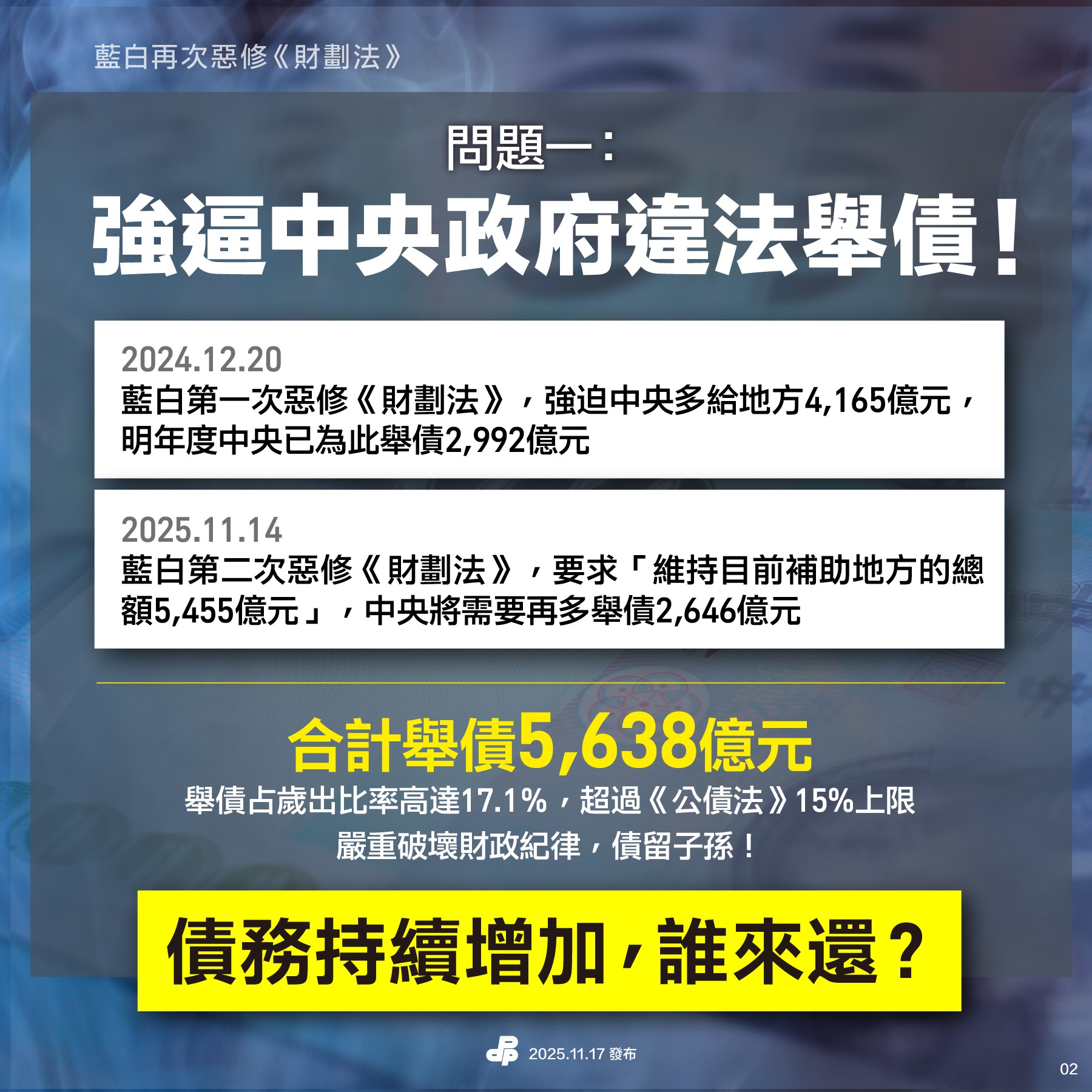 問題一:強逼中央政府違法舉債!債務持續增加,誰來還?