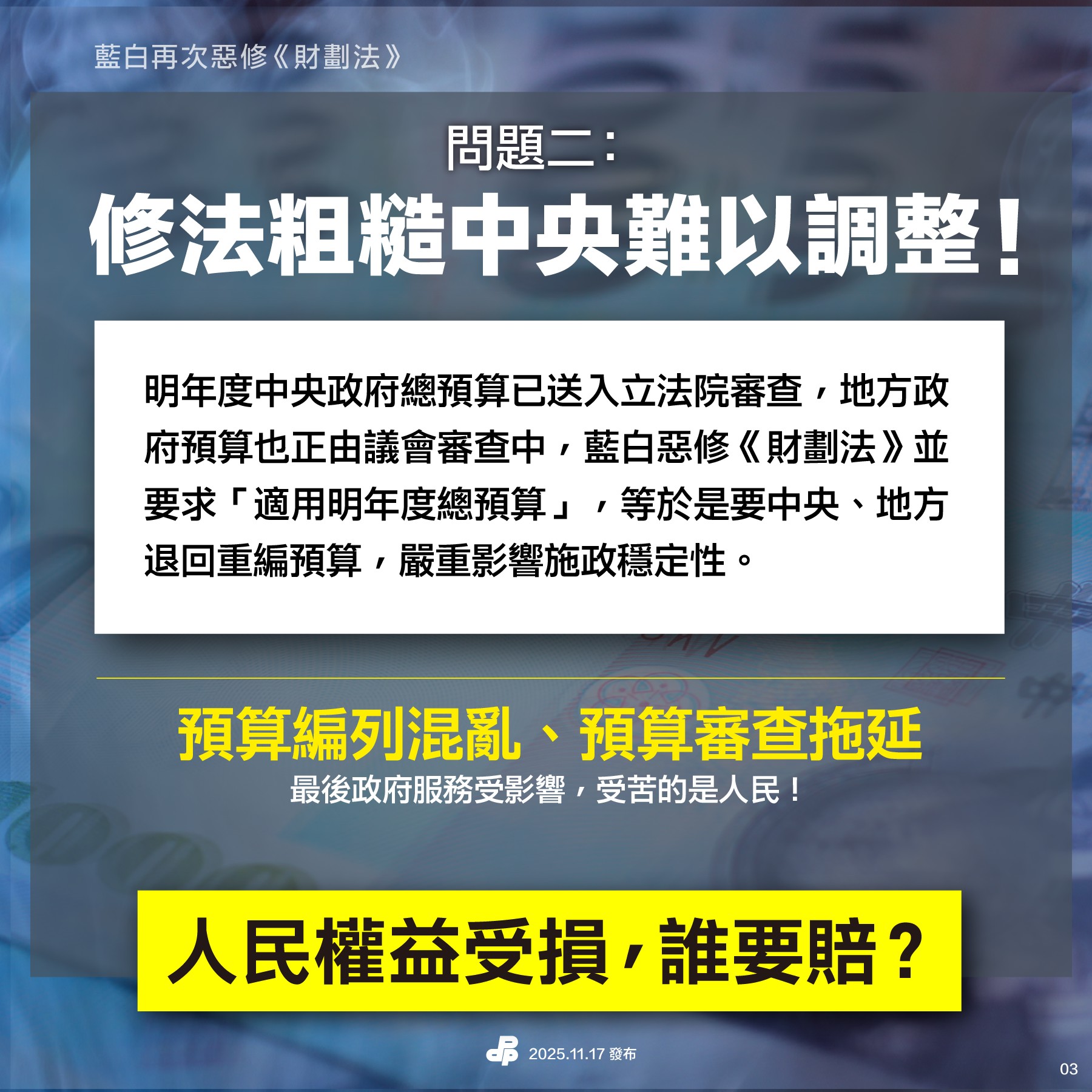 明年度中央政府總預算已送入立法院審查,地方政府預算也正由議會審查中,藍白惡修《財劃法》並要求「適用明年度總預算」,等於要中央、地方退回重編預算,施政穩定性嚴重受影響。