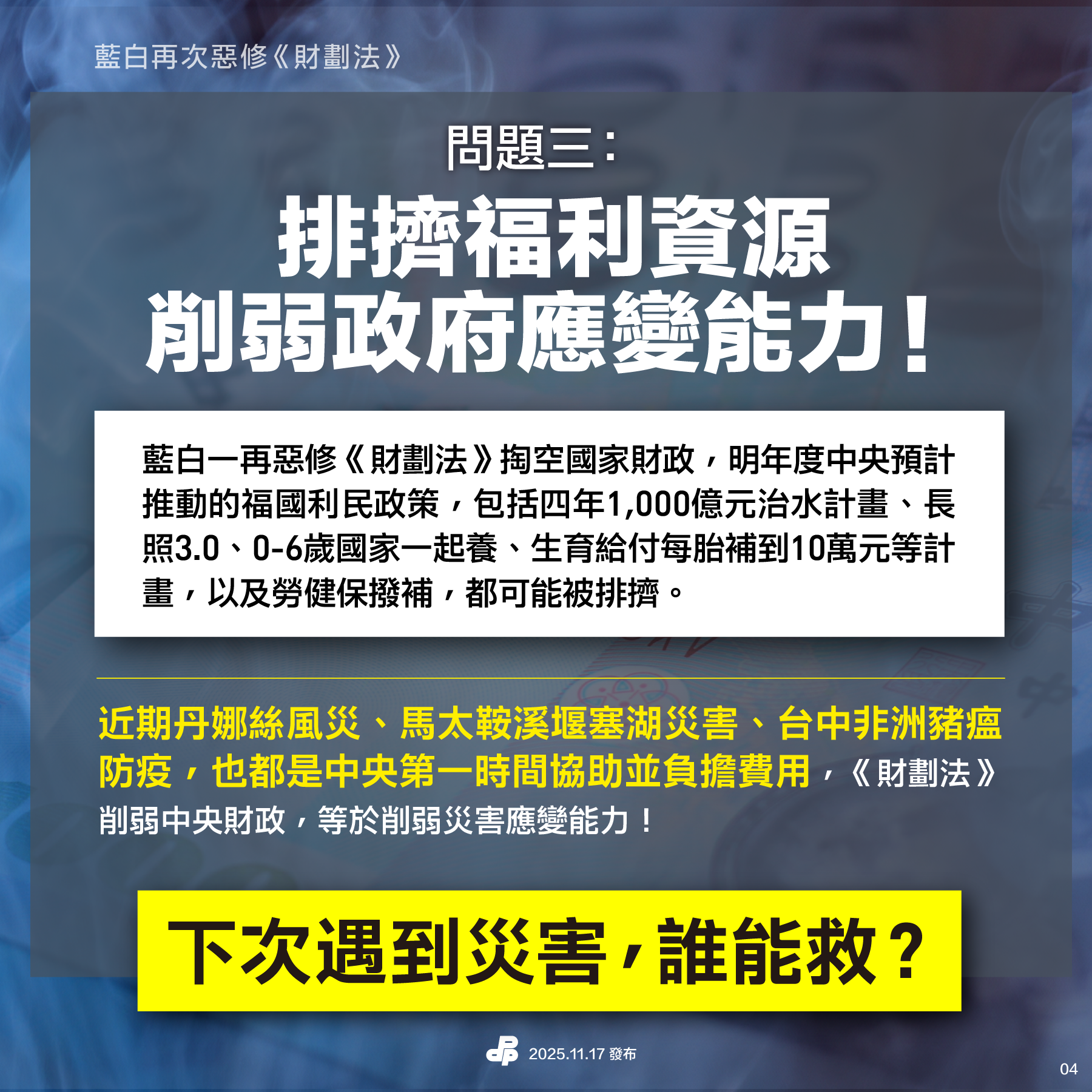 近期丹娜絲風災、馬太鞍溪堰塞湖災害、台中非洲豬瘟防疫,都是中央第一時間協助並負擔費用。《財劃法》削弱中央財政,也削弱災害應變能力!
