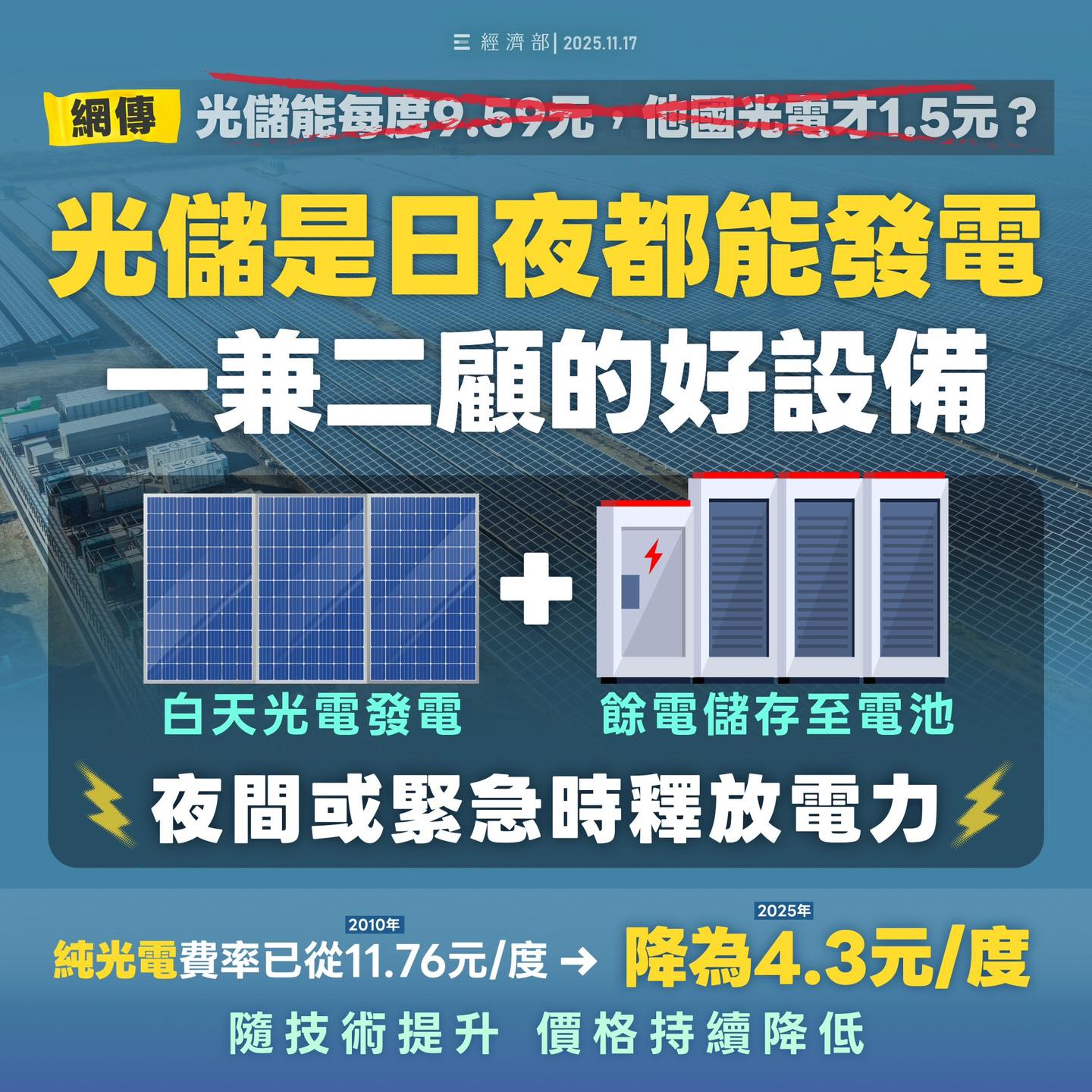 光電在白天發電,有多的電力就存進電池(儲能設備)裡,在夜尖峰或是緊急需要時就能釋放電力,每天約2-3小時,提升電網韌性,國際上也都如此,所以費率本來就會跟比單純的光電費率高。
