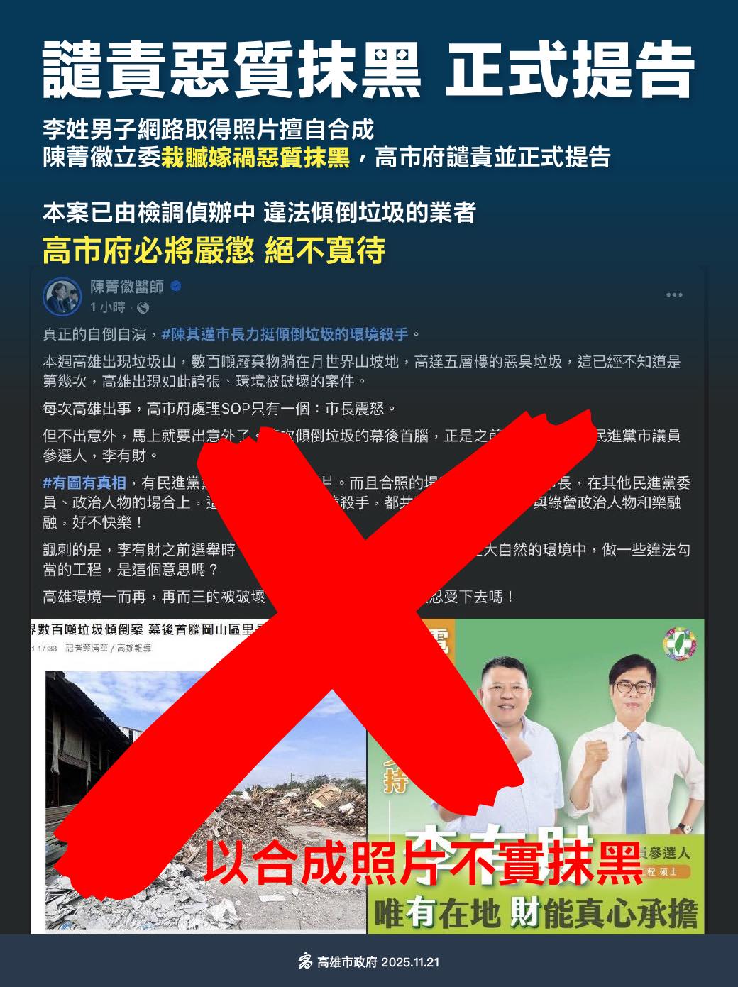 針對月世界垃圾山偷倒案件,立法委員陳菁徽發文指稱陳其邁市長力挺涉案的李姓男子。高市府表示,本案目前由檢調偵辦中,經查證該相片係2021年李男於網路取得且未經同意即擅自合成,張貼於其個人臉書封面。