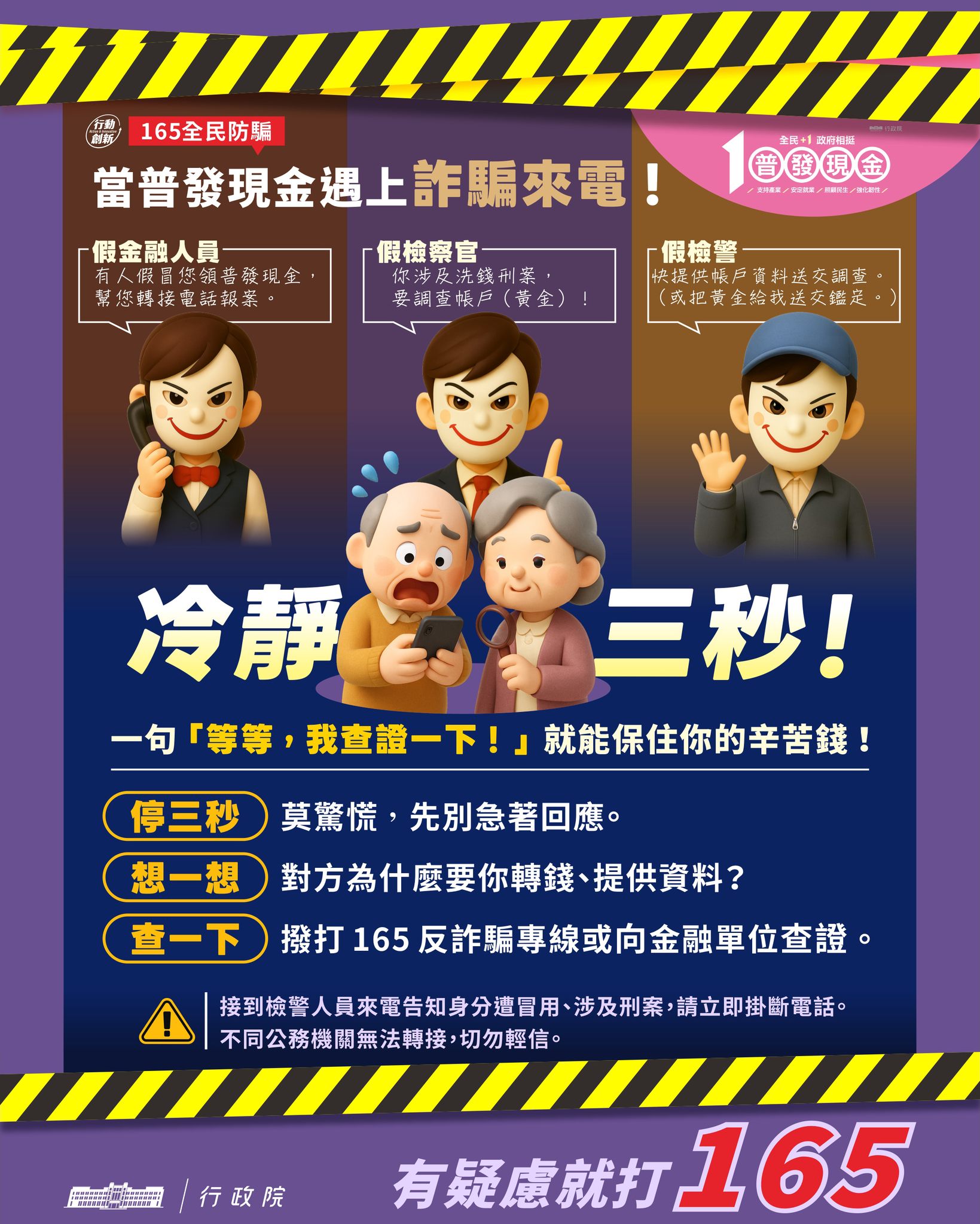 接到陌生來電,聲稱有人利用你的證件冒領普發現金1萬,可能涉案,需配合調查,千萬