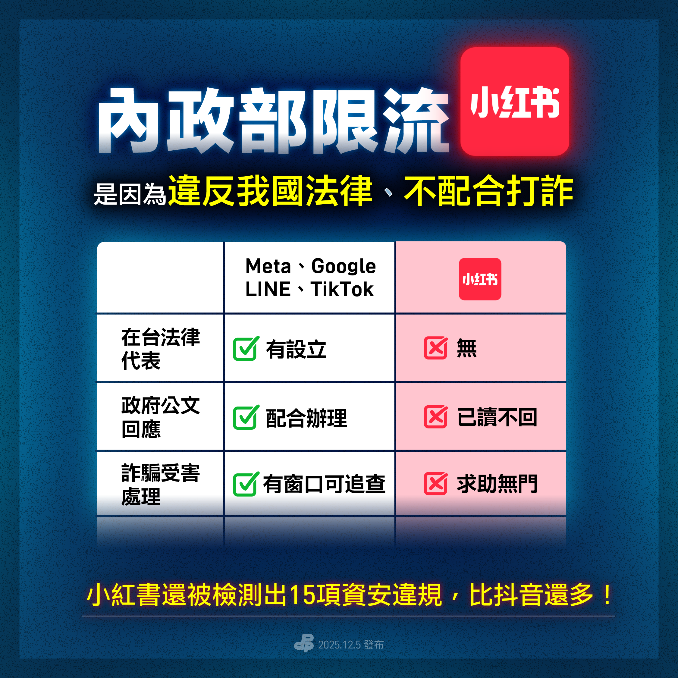 為了保護國人,不讓詐騙受害者求助無門,內政部發文請小紅書母公司依法提出具體改善作為卻被「已讀不回」後,才決定依據《詐欺犯罪危害防制條例》,限流小紅書一年,希望小紅書母公司能配合我國法律。