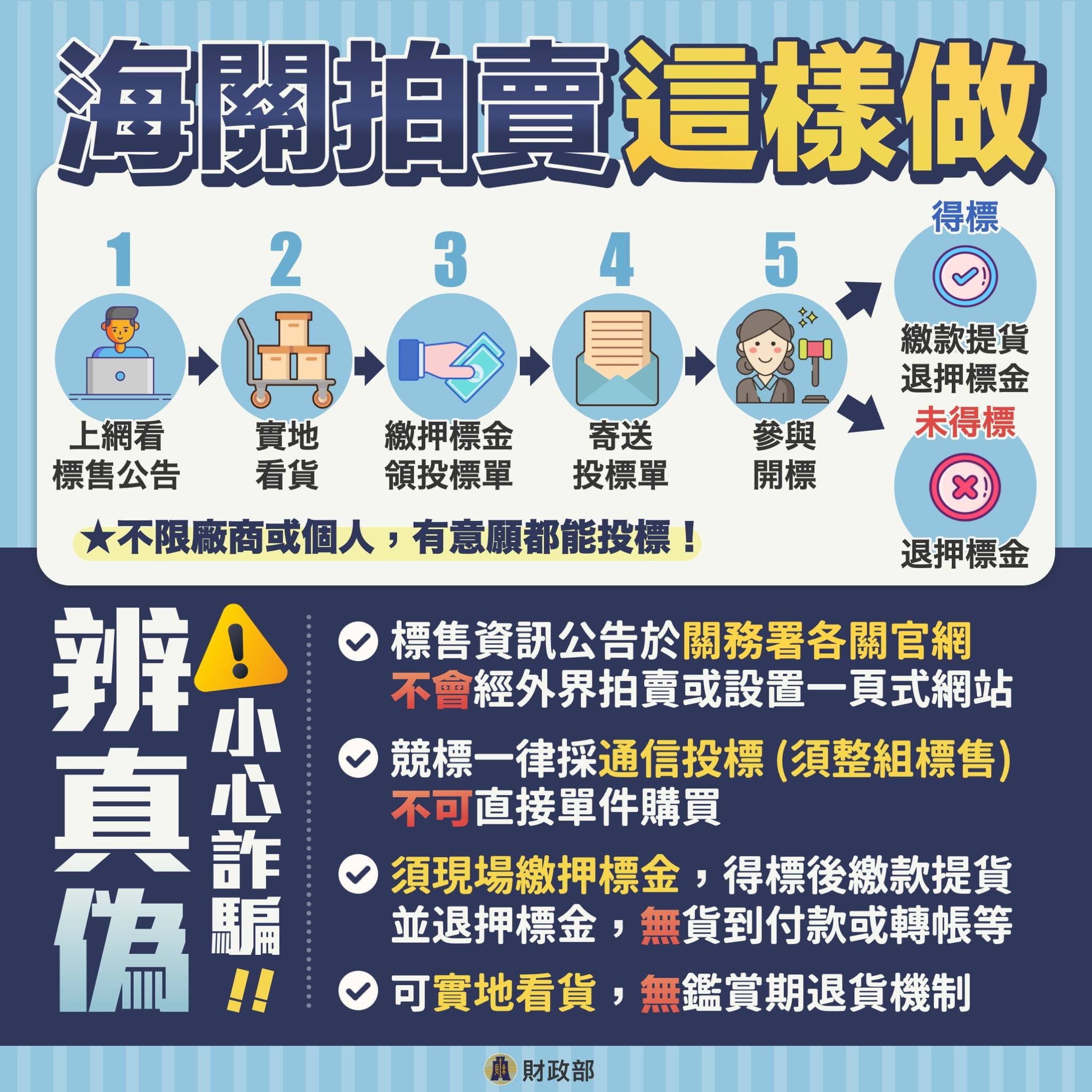 標售資訊公告於 #關務署各關官網(FB粉專認明藍勾勾),不會經外界拍賣或設置一頁式網站。