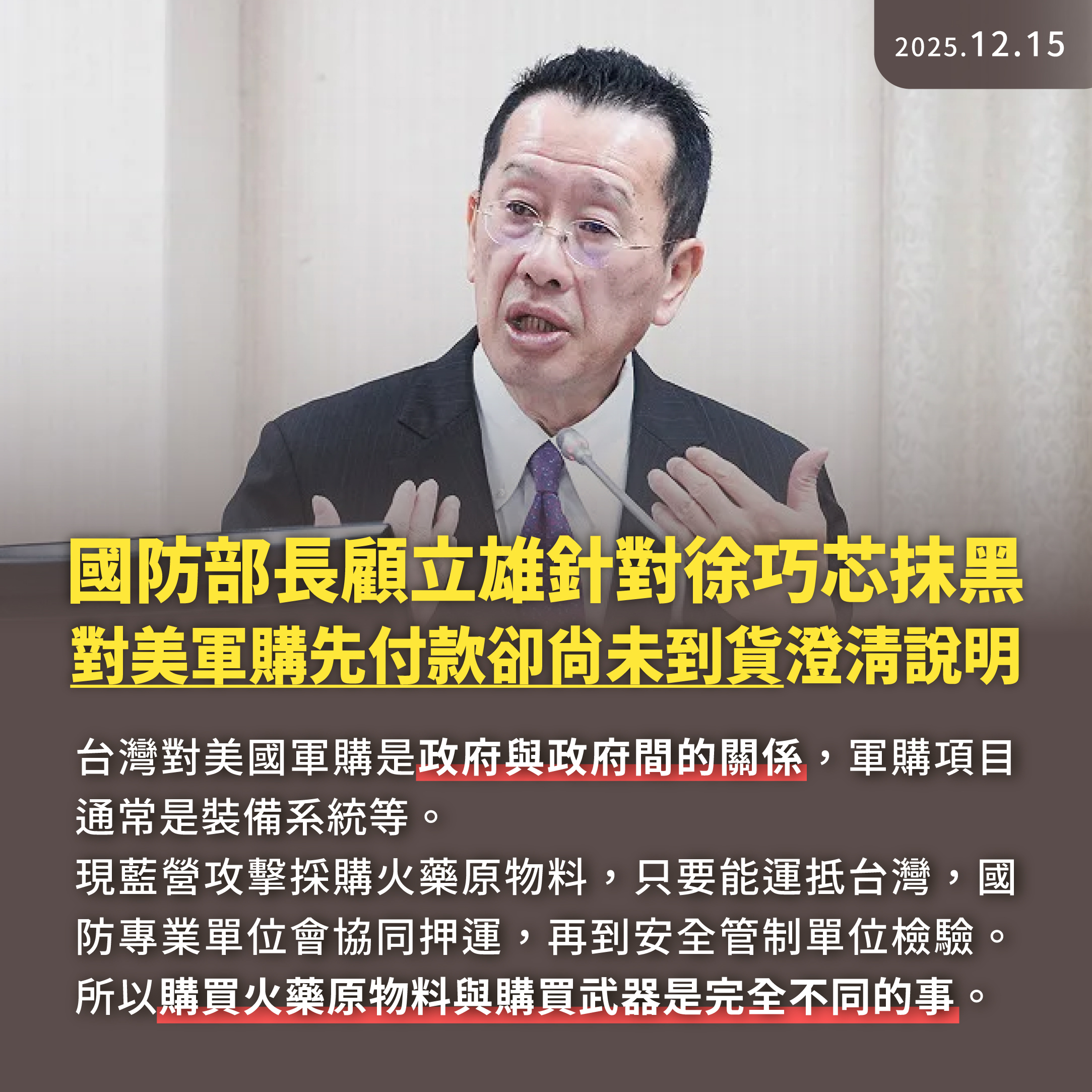 答:這一點我要嚴正聲明。我們對美軍購是政府與政府間,軍購項目通常都是裝備系統等等。現在的商品是火藥的原物料。所以它只要能運抵臺灣,我們的專業單位會協同押運,然後到安全管制單位進行檢驗。這是火藥原物料,火藥原物料的採購,跟我們的軍售,那是完全不同的事情。
