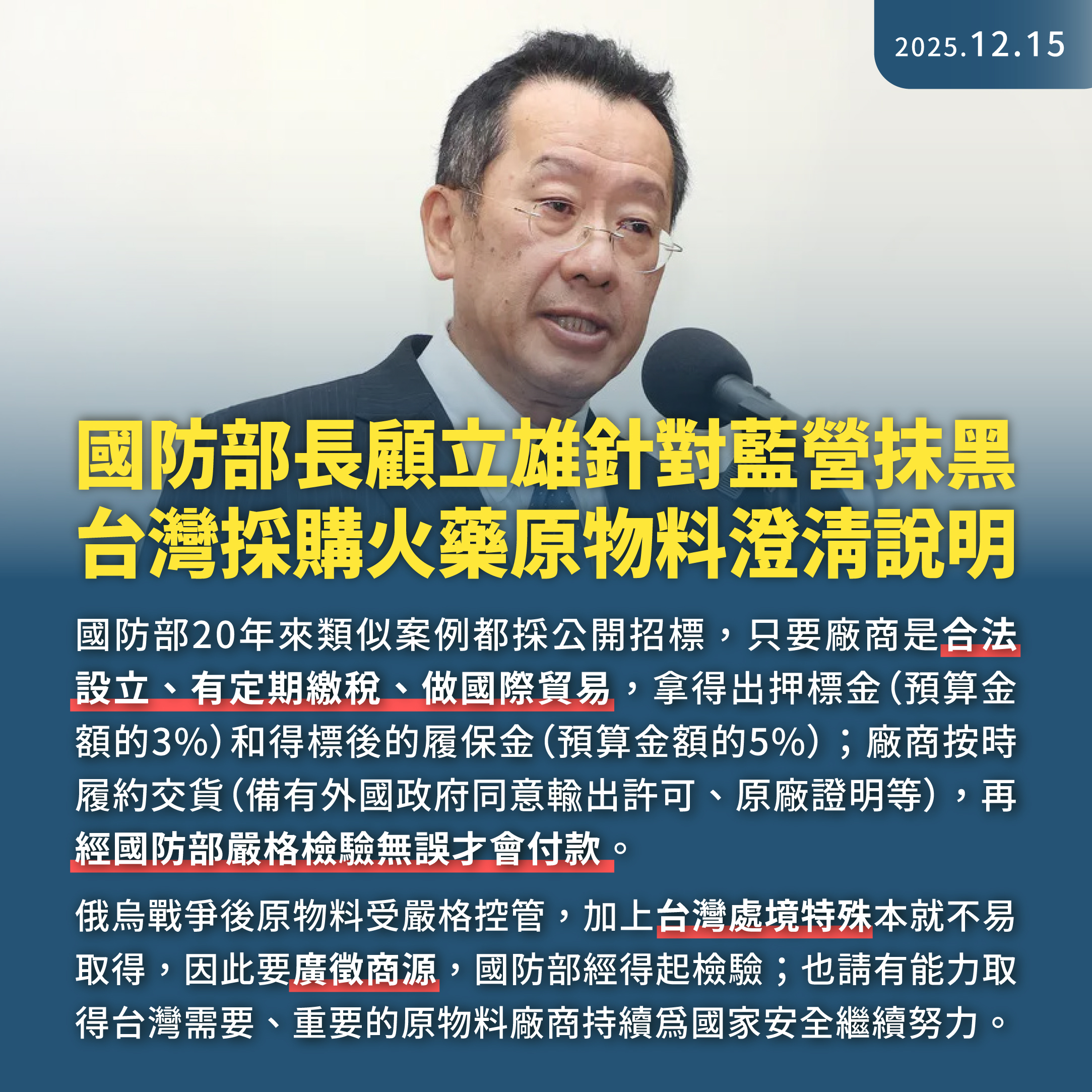 第三點我要強調的是,這些火藥原物料都受當地政府嚴格管制。俄烏戰爭後,都是以提供當地為優先,取得並不容易。再加上我們國家處境特殊。我們取得本來就不容易。因此我們要廣徵商源,讓所有有能力的人都能夠進來。但他進來的當下,就要衡量有沒有辦法履約,這我剛剛已經一再地強調。