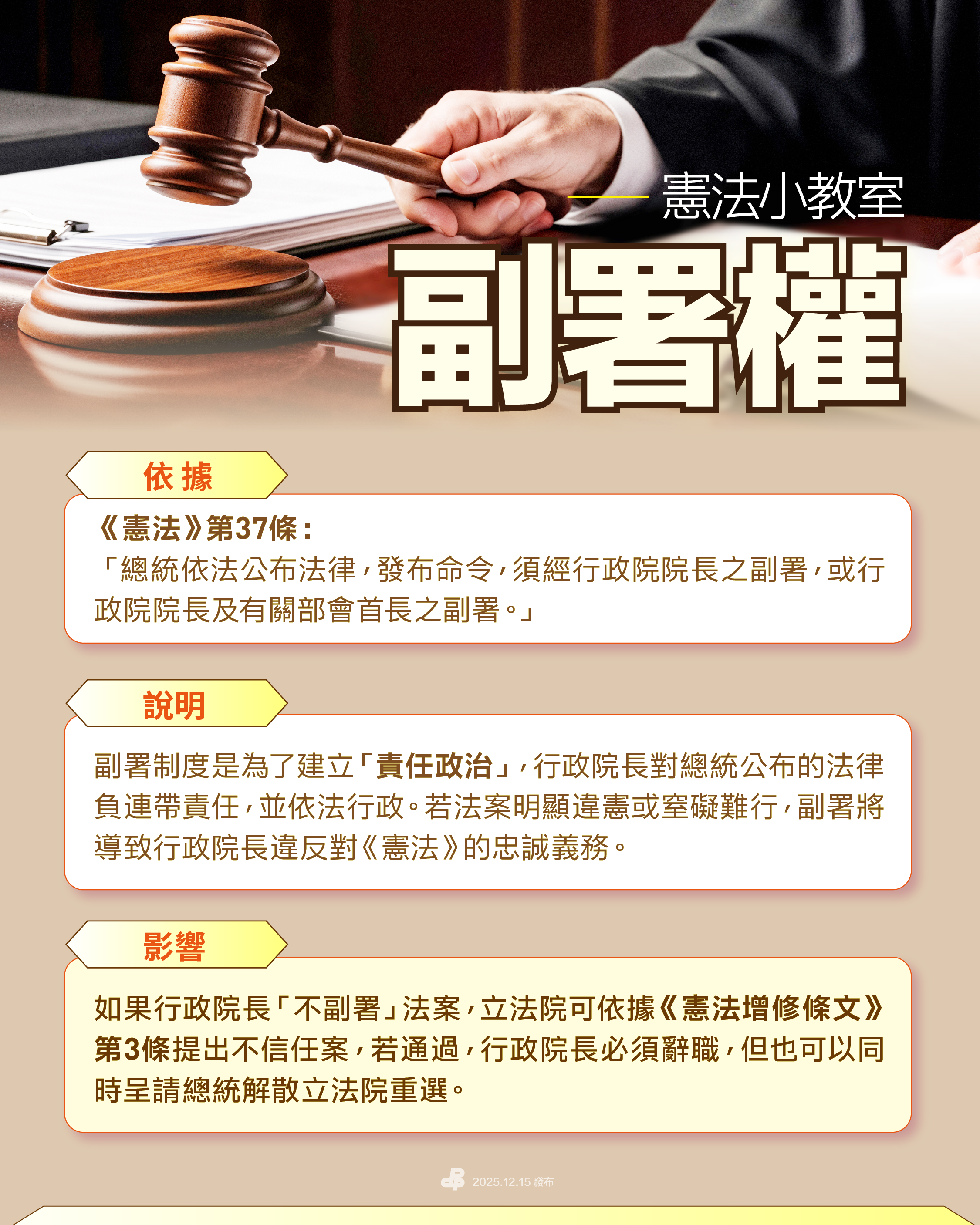 【說明】副署制度是為了建立 #責任政治,行政院長要對總統公布的法律負連帶責任,並依法行政。若法案明顯違憲或窒礙難行,副署將導致行政院長違反對《憲法》的忠誠義務。