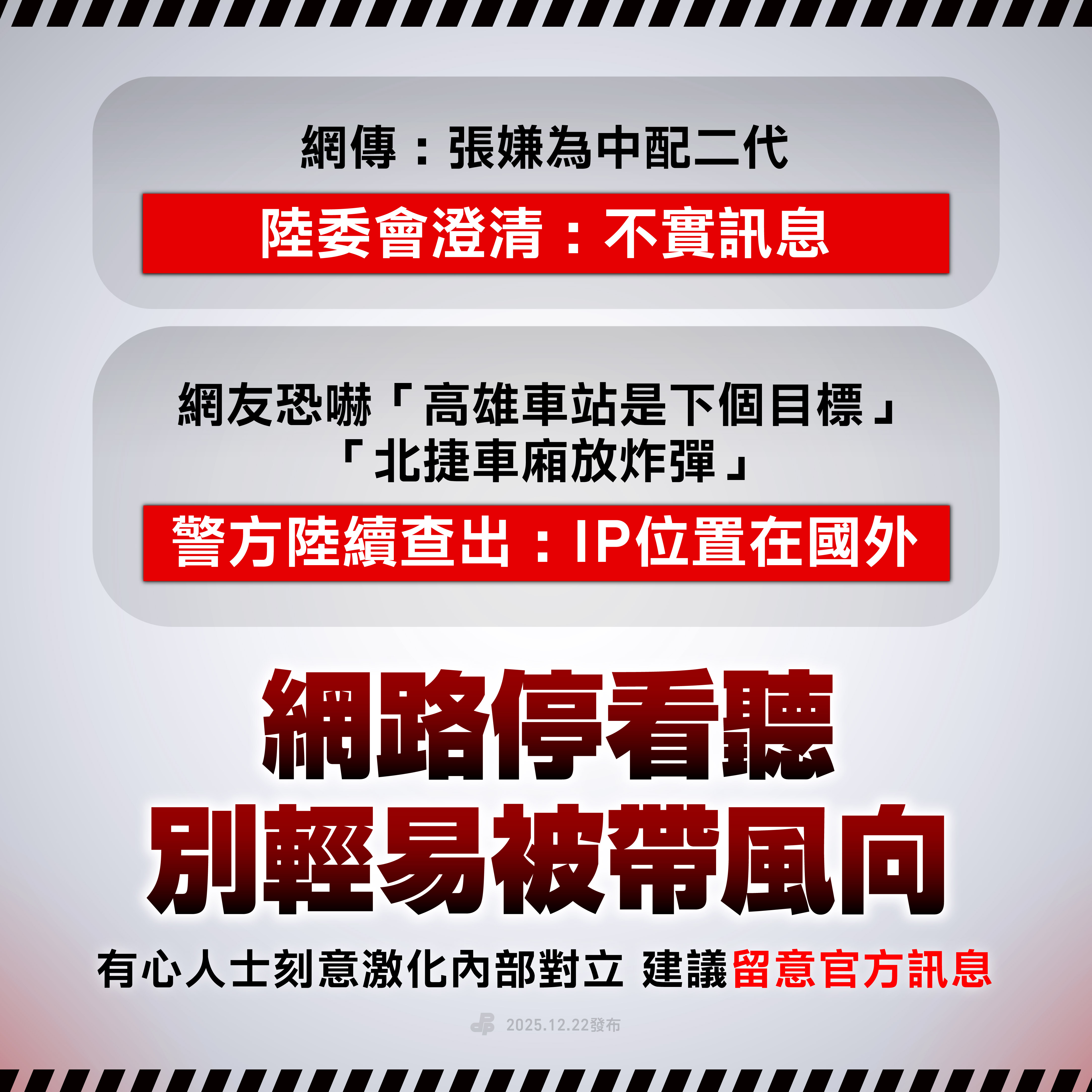 請大家一同留意官方發布資訊,冷靜查證,不隨意轉傳未經證實內容,就是對社會最大的幫助。