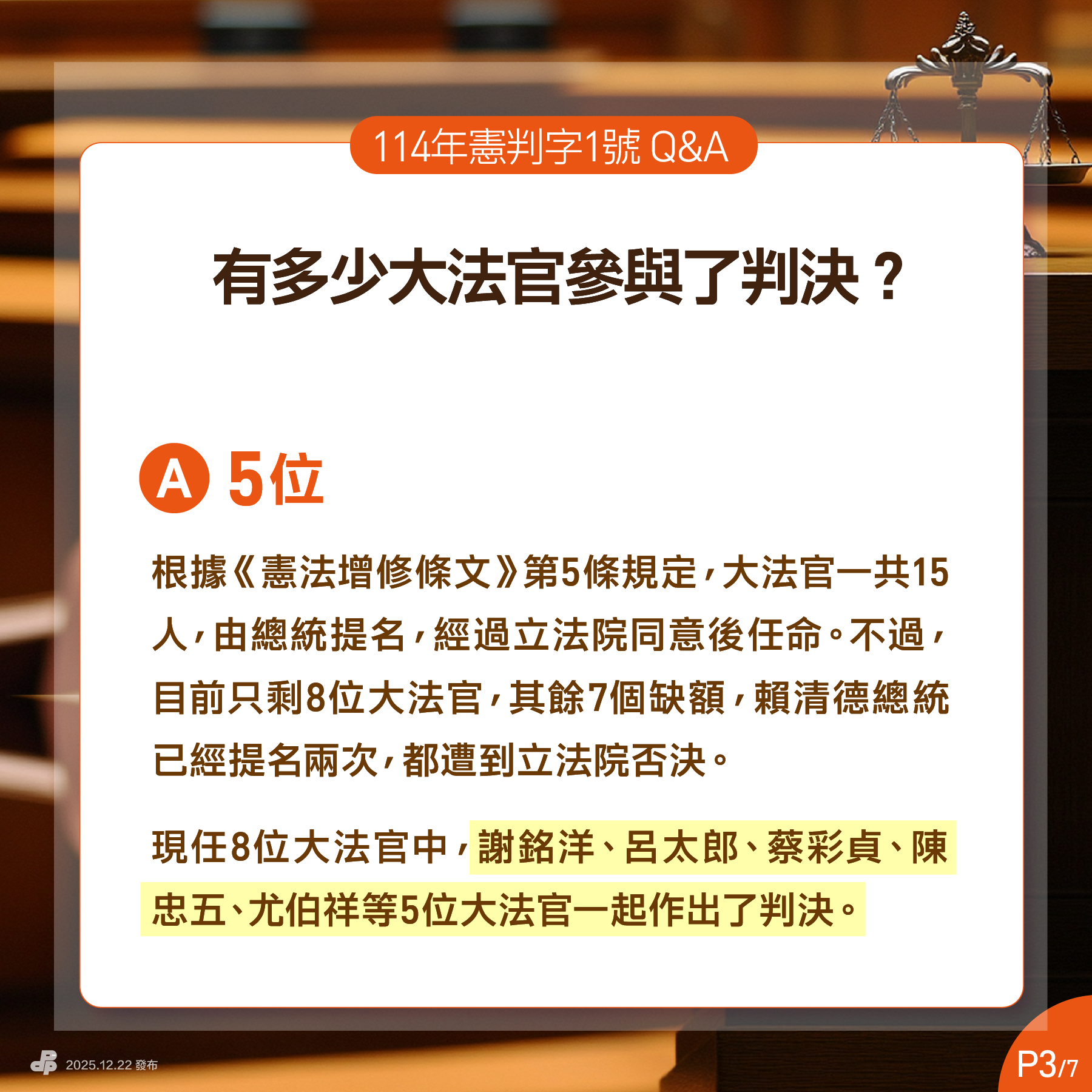 現任8位大法官中,#謝銘洋、#呂太郎、#蔡彩貞、#陳忠五、#尤伯祥 等5位大法官一起作出了判決。