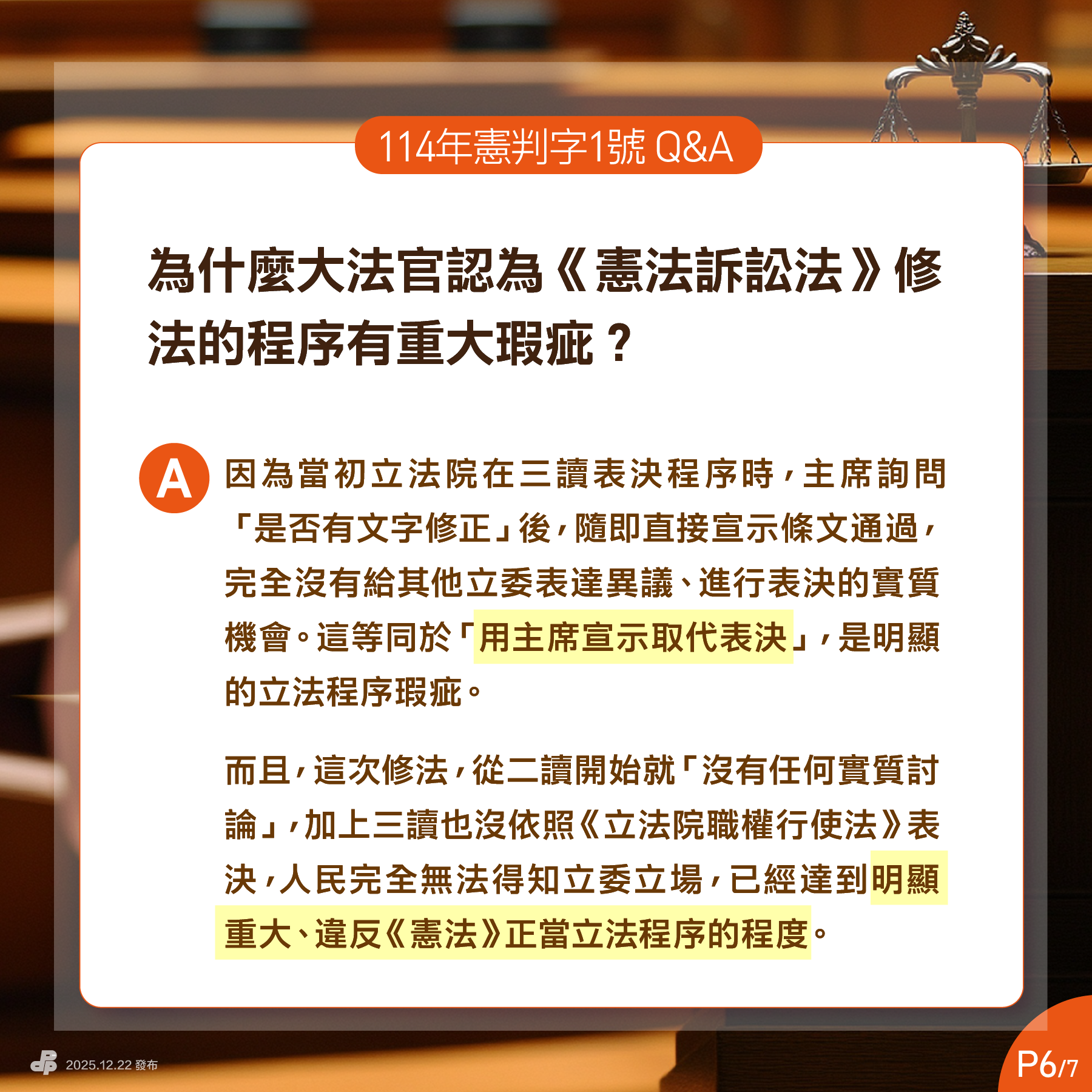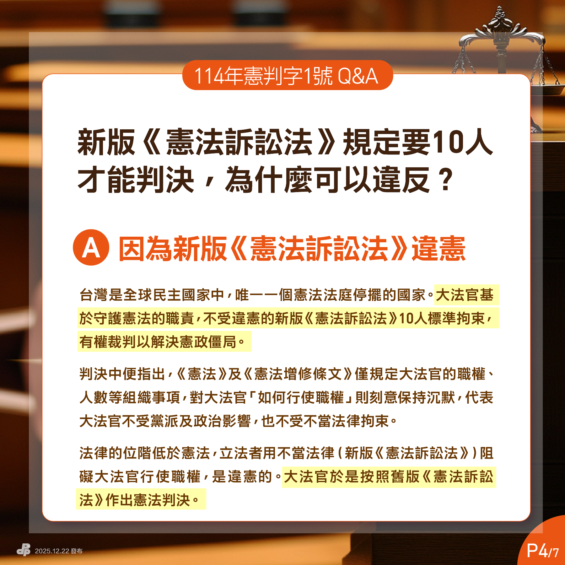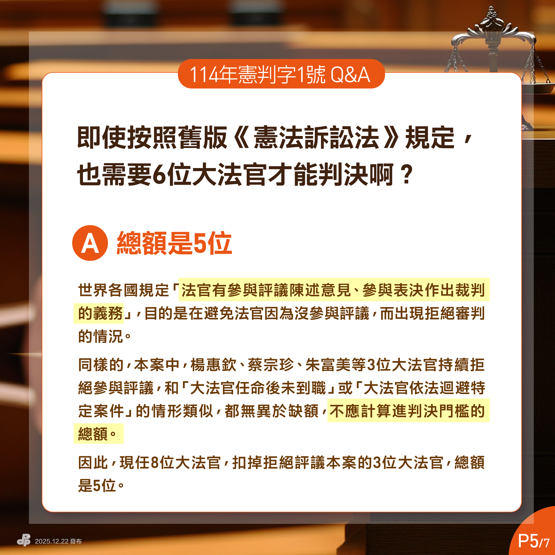 Q4:即使按照舊版《憲法訴訟法》規定,也需要6位大法官才能判決啊?