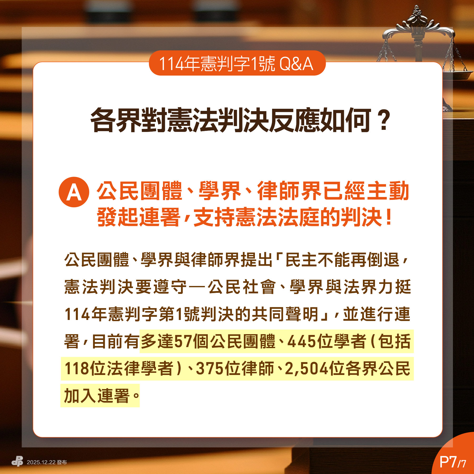 公民團體、學界與律師界提出「民主不能再倒退,憲法判決要遵守—公民社會、學界與法界力挺114年憲判字第1號判決的共同聲明」,並進行連署,目前有多達57個公民團體、445位學者(包括118位法律學者)、375位律師、2,504位各界公民加入連署。