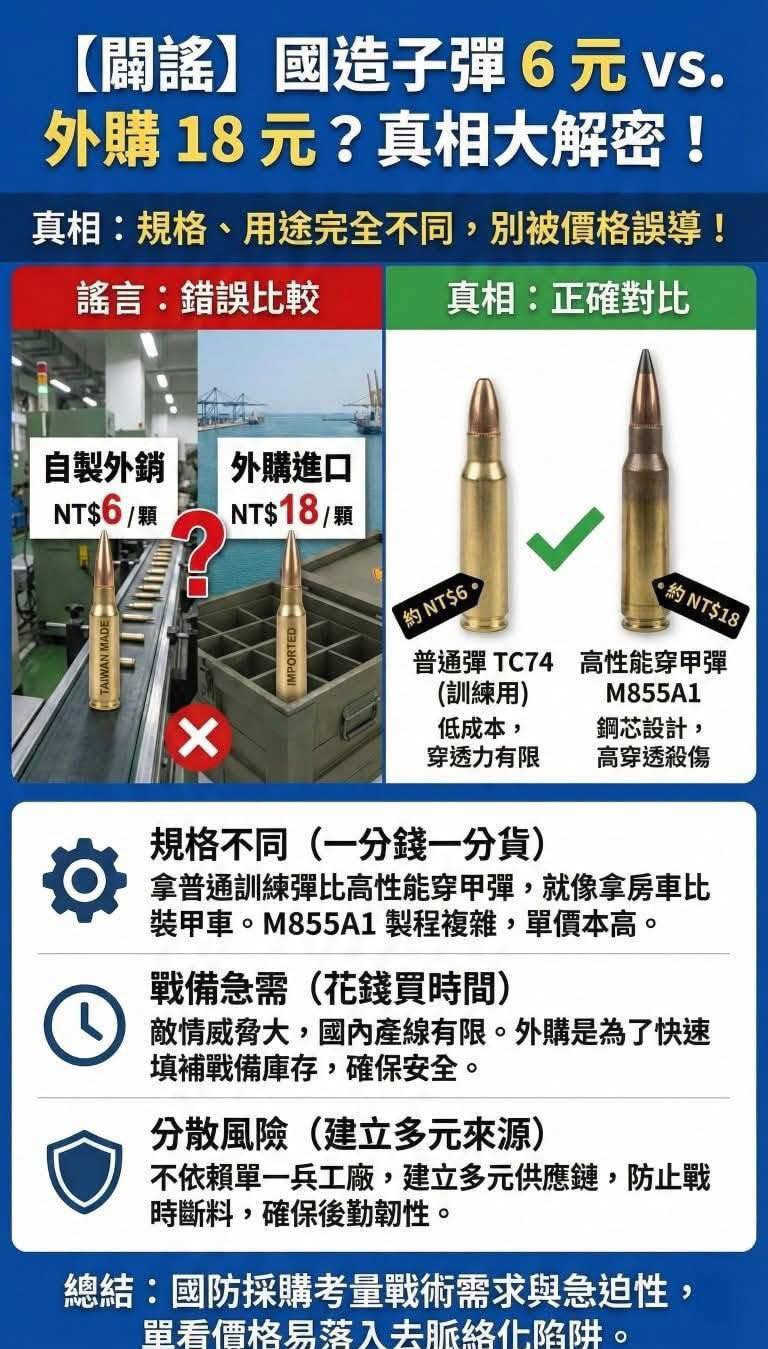 另外2005年美國陸軍向台灣訂購 3億發 5.56mm 子彈,背景是伊拉克、阿富汗用量大,補美軍庫存,合約規定由美國提供火藥、底火、銅等所需材料,台灣兵工廠純代工,這個2005年的每顆6元,只有代工費而已,連這個都不查證,這叫做「不專業」。
