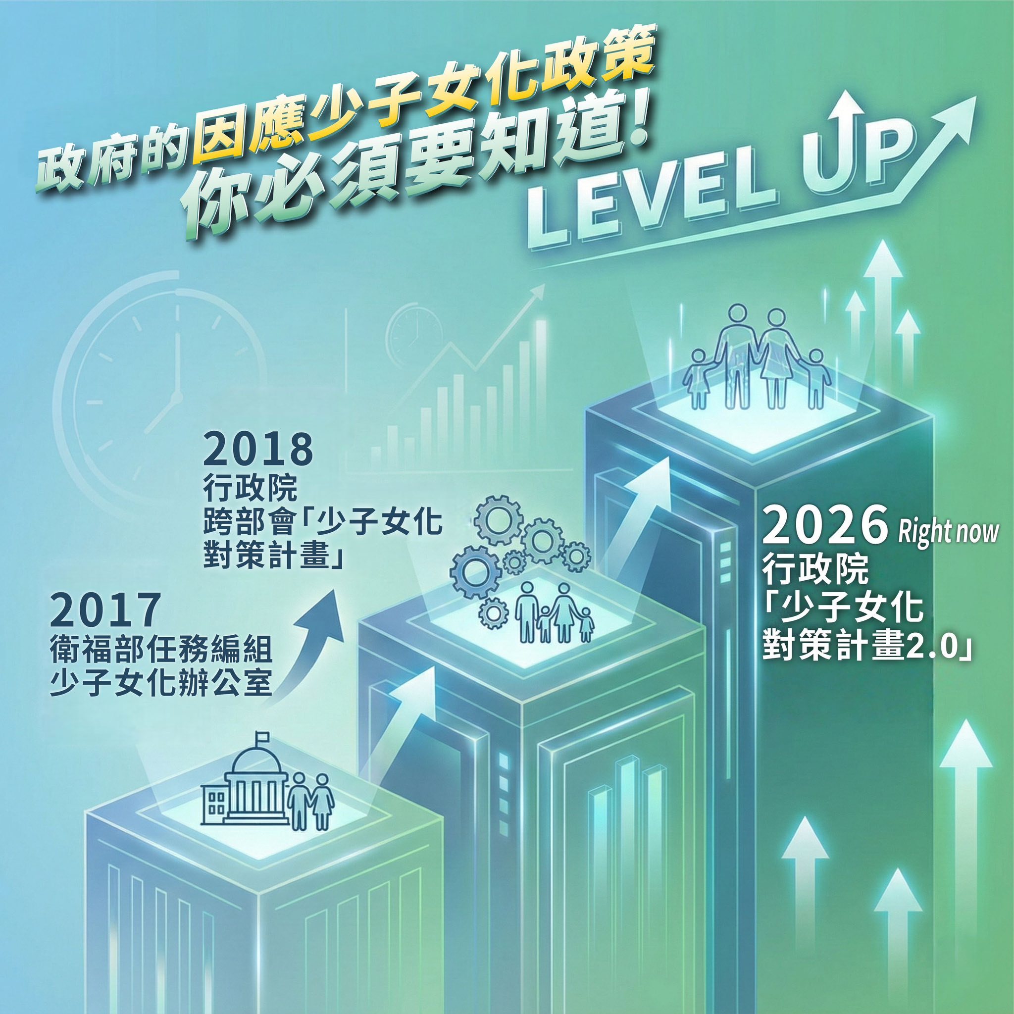 第一,衛福部任務編組性質的少子女化辦公室,雖然沒有實體空間,但是各項工作都會透過這個任務編組辦公室協調聯繫,2017年開過數次會後,就升級為行政院的「少子女化對策計畫」,跨部會共同執行,今年已經是2.0版。