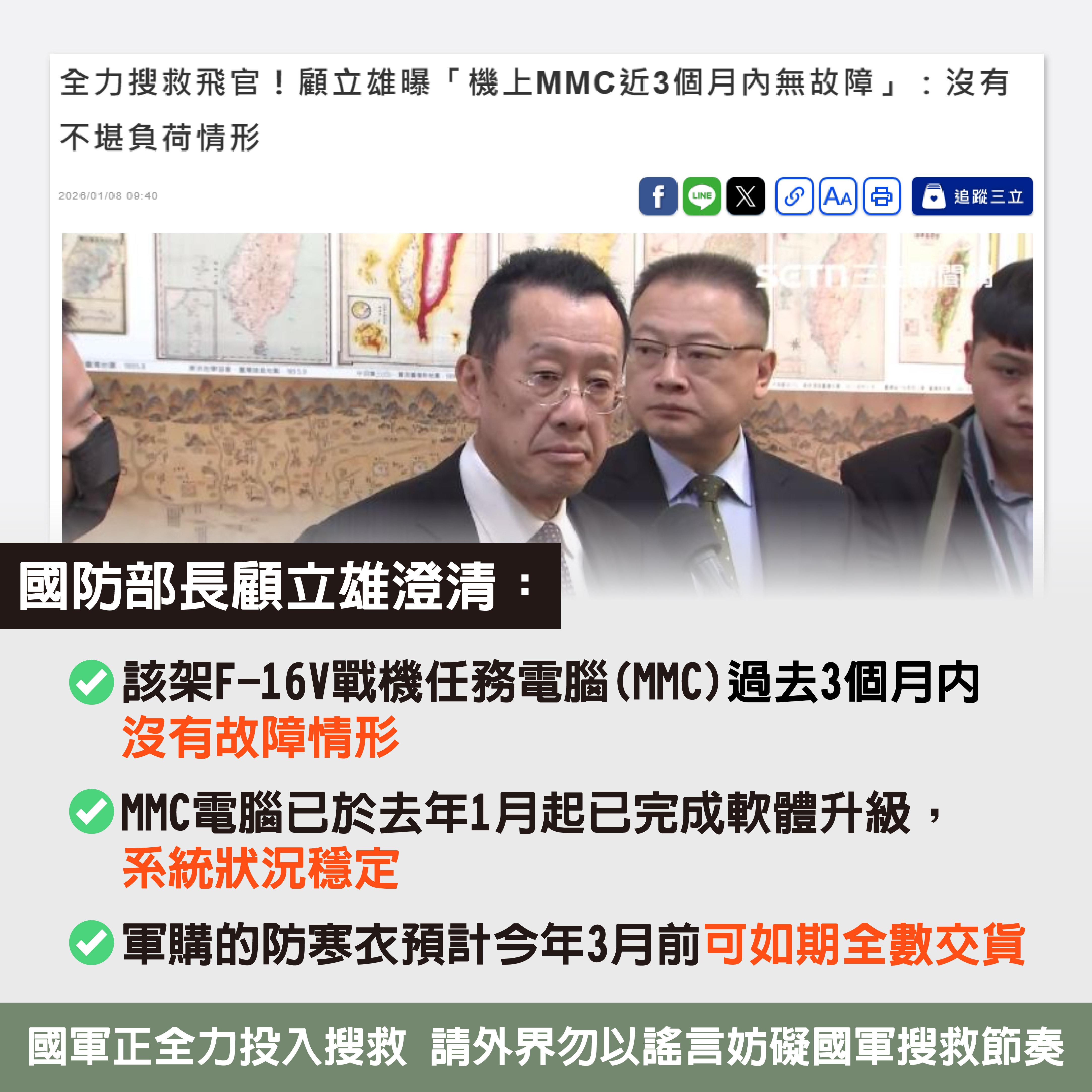 花蓮空軍基地一架F-16V失事,29歲上尉飛官辛柏毅至今失聯。國防部長顧立雄今(8日)受訪表示,現在的唯一目標就是「盡全力搜救」,對於F-16V戰機任務電腦(MMC)故障一事,顧立雄駁斥稱,經查該架飛機在過去3個月內並無MMC故障情況,是妥善的,MMC電腦在升級後軟體確實需進行調整,自民國114年1月起已完成軟體升級,系統狀況穩定,並無「不堪負荷」的情形。