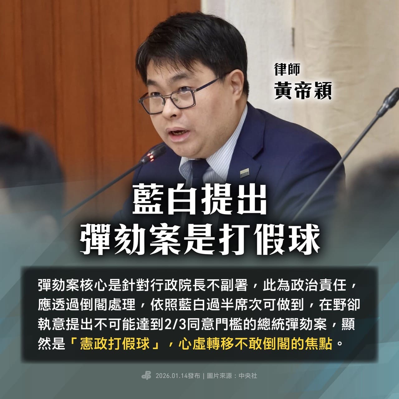 彈劾案核心是針對行政院長不副署,此為政治責任,應透過倒閣處理,依照藍白過半席次可做到,在野卻執意提出不可能達到2/3同意門檻的總統彈劾案,顯然是「憲政打假球」,心虛轉移不敢倒閣的焦點。