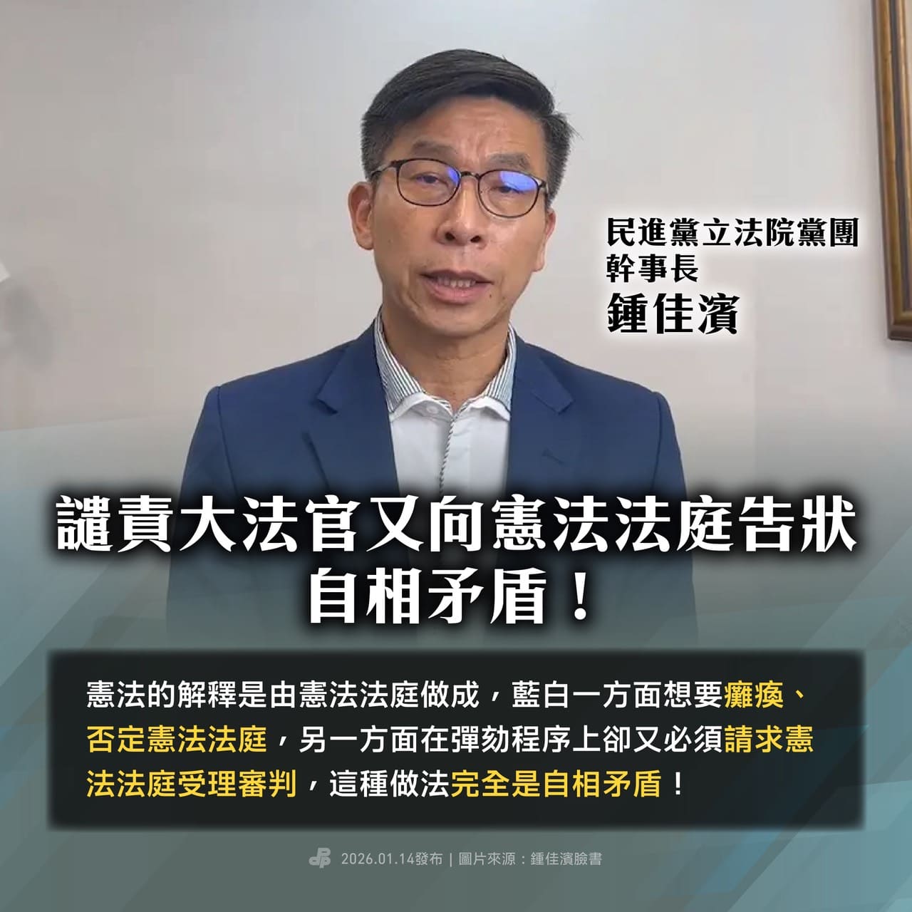 民進黨立法院黨團 #鍾佳濱 幹事長:譴責大法官又向憲法法庭告狀,自相矛盾!