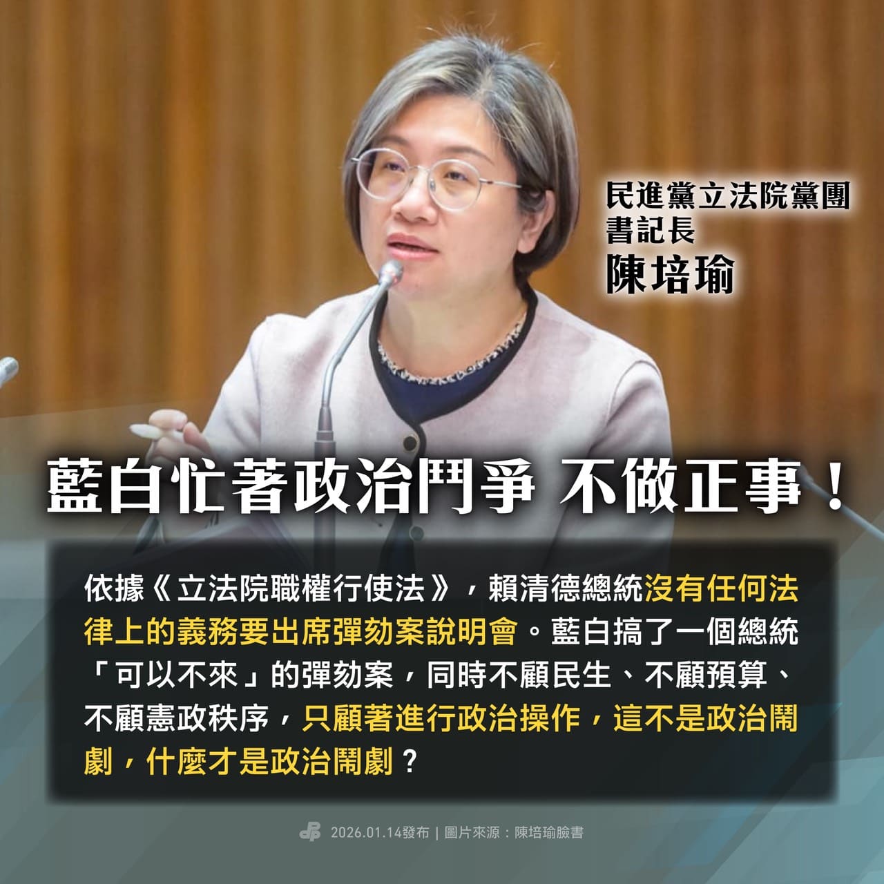 依據《立法院職權行使法》,賴清德總統沒有任何法律上的義務要出席彈劾案說明會。藍白搞了一個總統「可以不來」的彈劾案,同時不顧民生、不顧預算、不顧憲政秩序,只顧著進行政治操作,這不是政治鬧劇,什麼才是政治鬧劇?