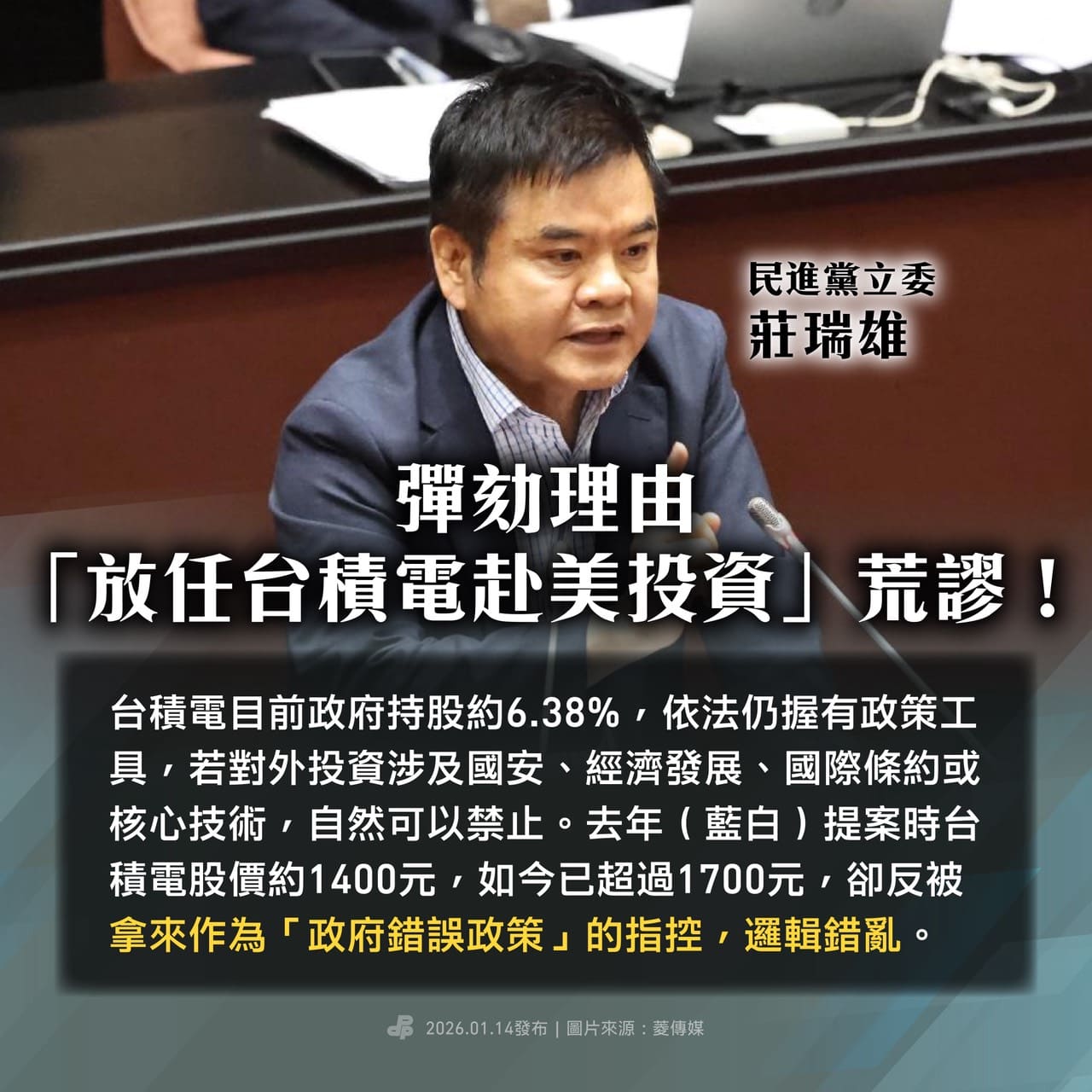 民進黨 #莊瑞雄 委員:彈劾理由「放任台積電赴美投資」荒謬!