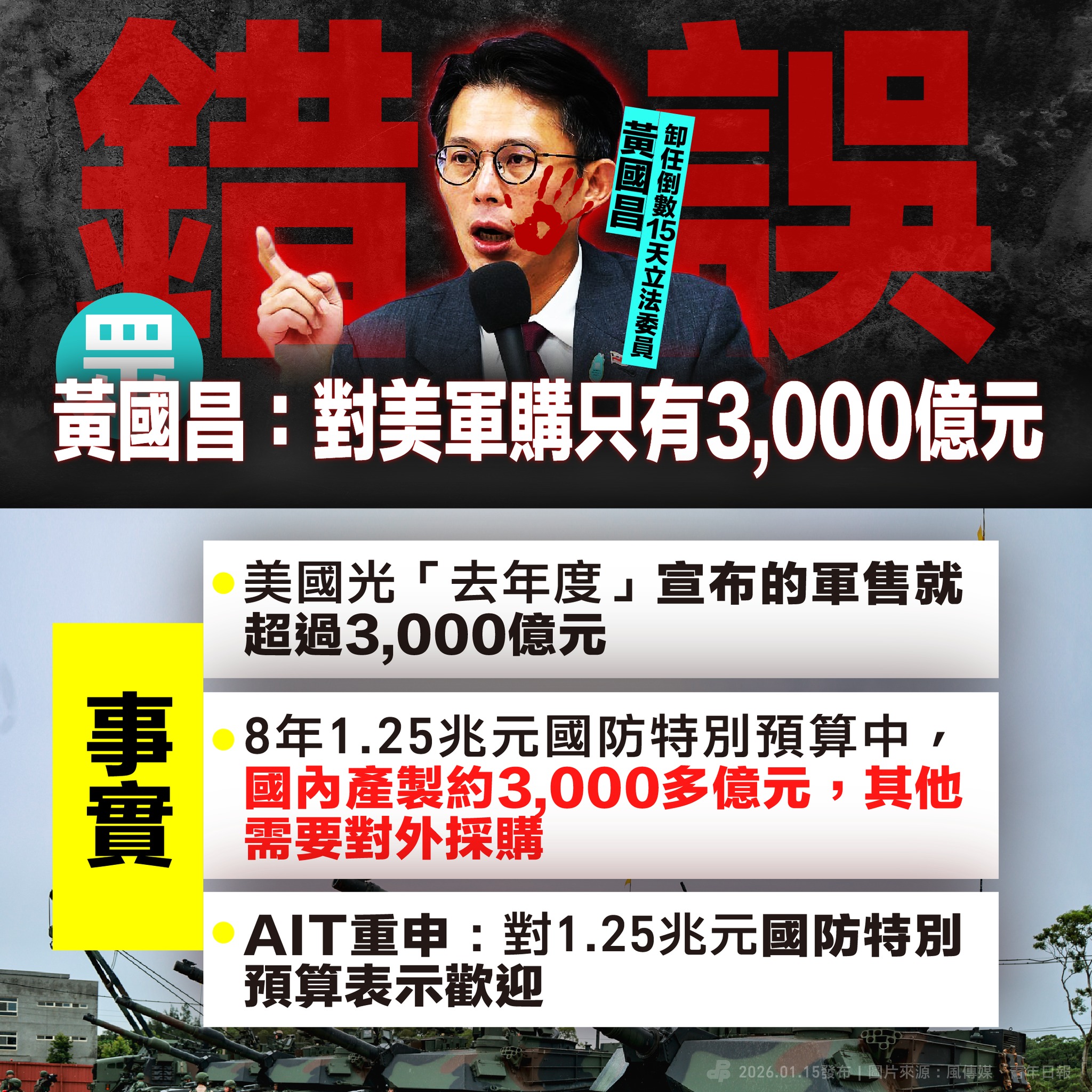 我們知道距離黃國昌立委卸任的時間不遠了,但就算是任期倒數15天立法委員,難道就可以完全不查證嗎?期盼 #民眾黨 立委們善盡職責,在剩下的任期中,趕快排審 #總預算 與 #國防特別預算條例 吧!