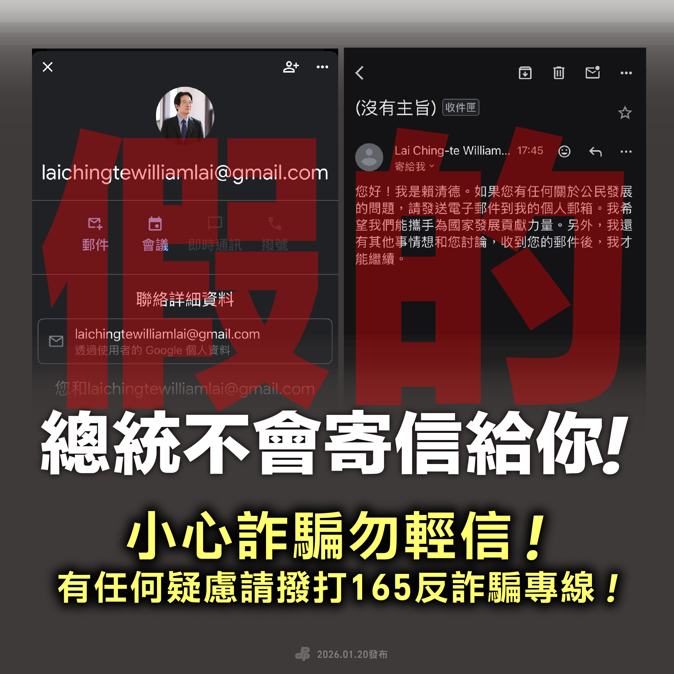 近期有不明人士冒用賴清德總統名義寄送電子郵件,並誘導民眾回覆。提醒大家,這是假的!