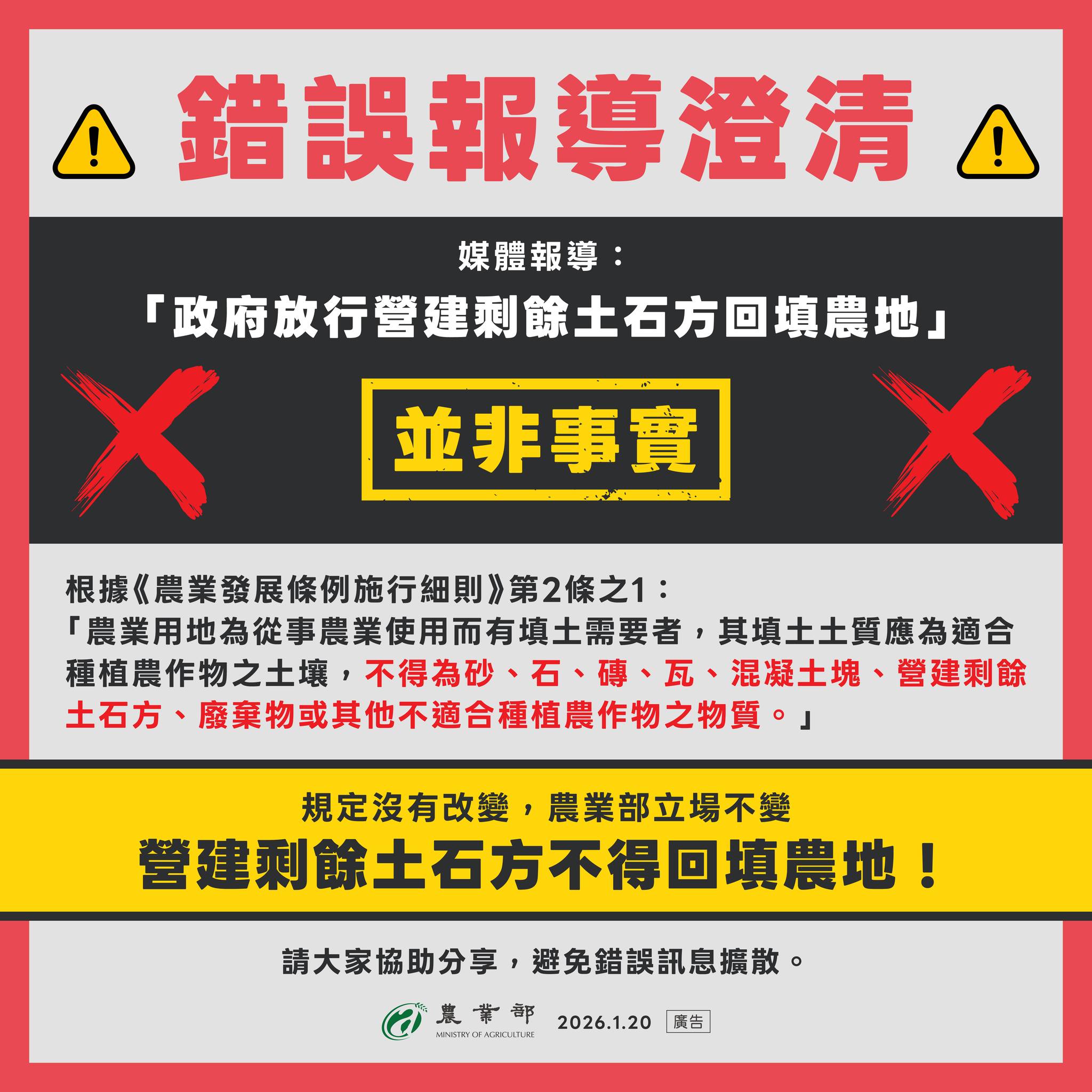 媒體報導「政府放行營建剩餘土石方回填農地,合法掩護非法,助長農地成棄土天堂」,內容並非事實。