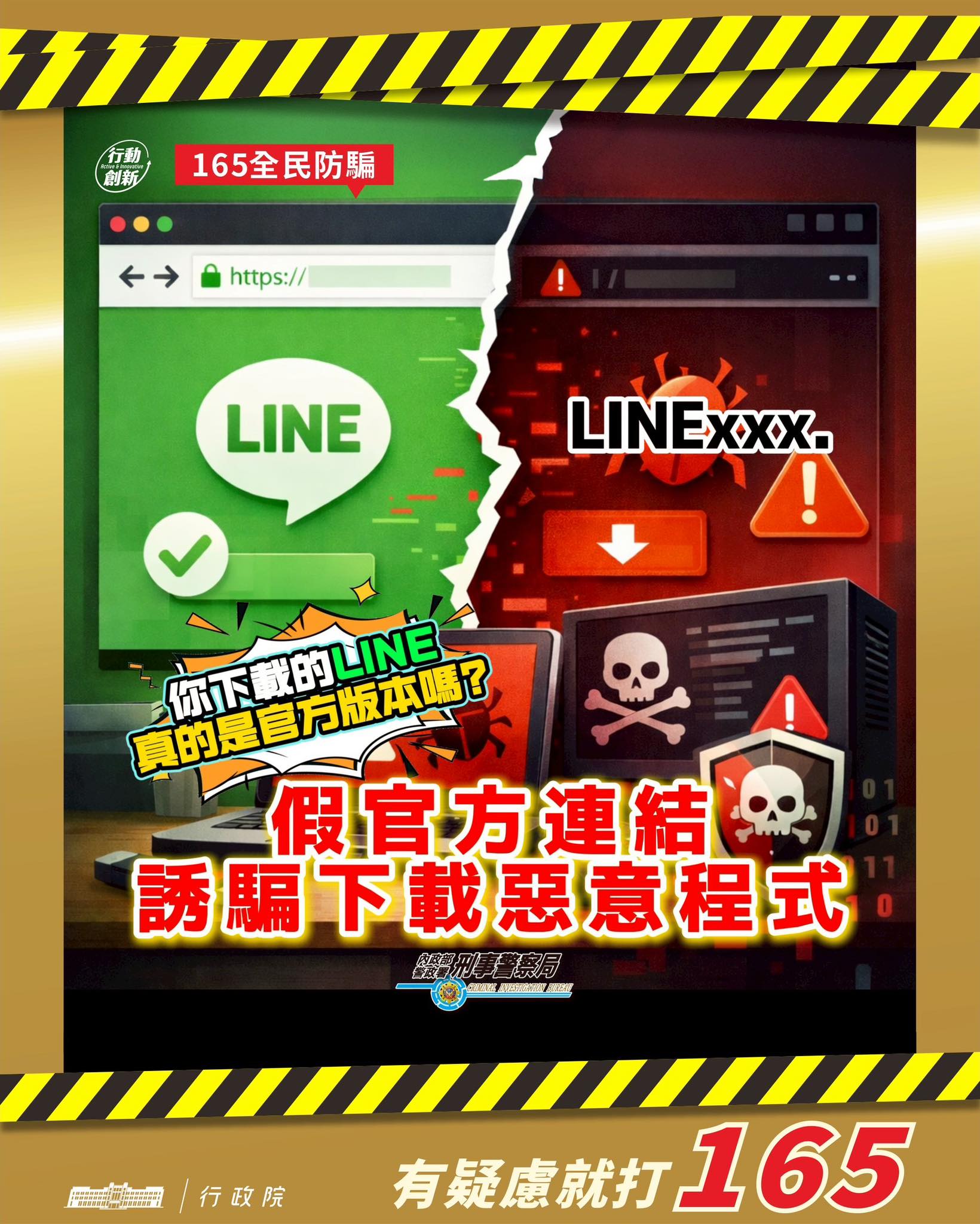 詐騙集團已有架設假LINE官方的「電腦版」下載網站,網址與官方僅差一、二個字母,誘騙使用者下載內含惡意程式的安裝檔,將導致電腦出現異常狀況。