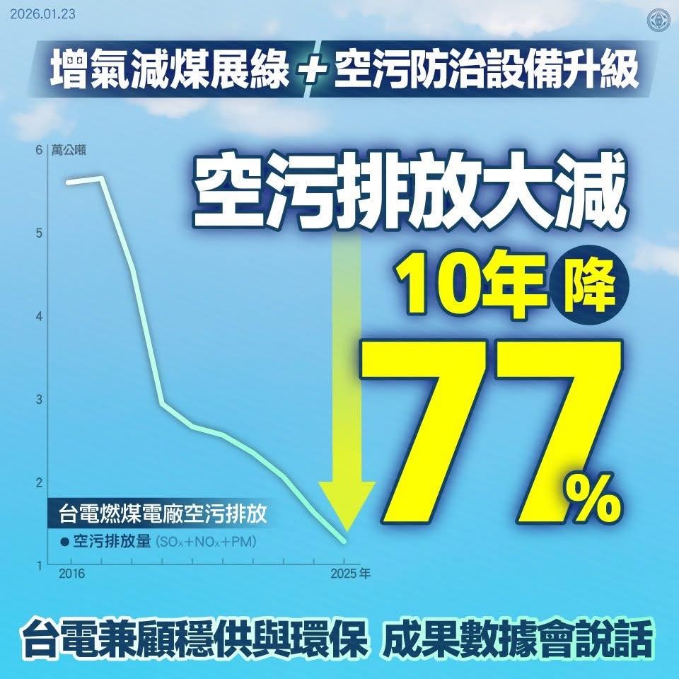 整體成效:台電燃煤電廠空污排放量,已從2016年的 5.6 萬公噸,減至 2025年的1.3萬公噸。減少超過4萬公噸,減幅達77%。