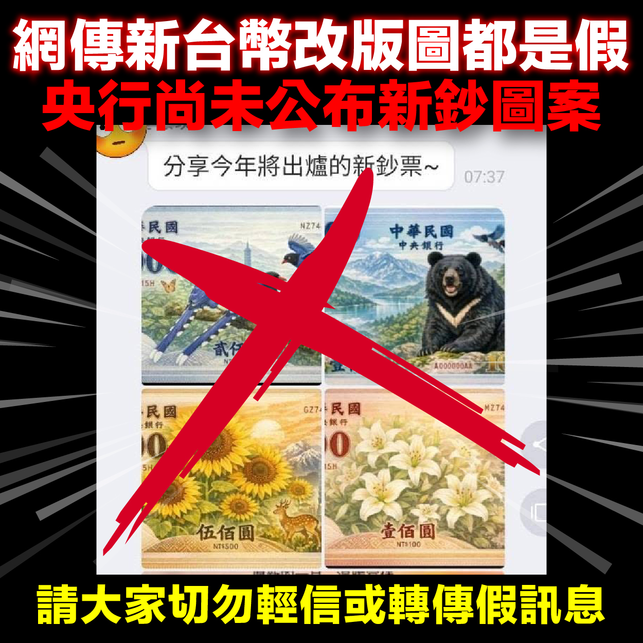 2026-02-05 網傳新台幣改版圖都是假 網傳新台幣改版圖都是假 央行尚未公布新鈔圖案 央行日前啟動「台灣之美」新版新台幣面額主題票選活動,以文字方式說明12項面額主題選項,並未公布任何新版鈔券設計圖案,如今網路上出現各種假鈔券圖案,皆非央行所發布,也非任何規畫中之內容,請大家切勿輕信或轉傳。 後續如有新台幣鈔券改版相關重要訊息,央行將透過官方管道對外發布,請大家以央行正式發布公告為準,避免轉傳未經查證之訊息。 中央社新聞:https://www.cna.com.tw/news/afe/202602040287.aspx 新台幣 改版 央行 鈔票