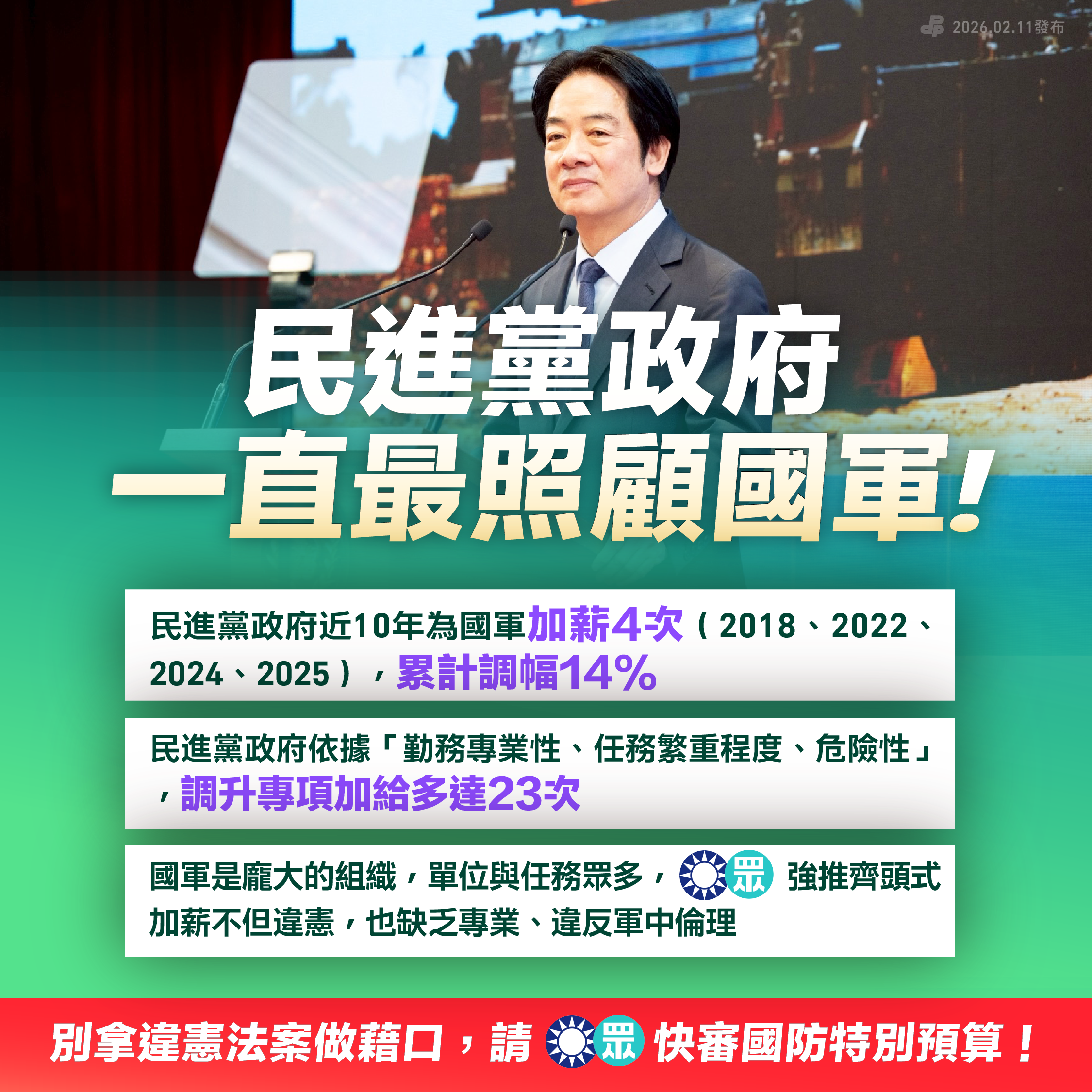 🔺近10年內,民進黨政府依據「勤務專業性、任務繁重程度、危險性」,為國軍調升 #專項加給 多達23次。同時也推動裝備換新、老舊眷舍改建,具體照顧國軍權益。