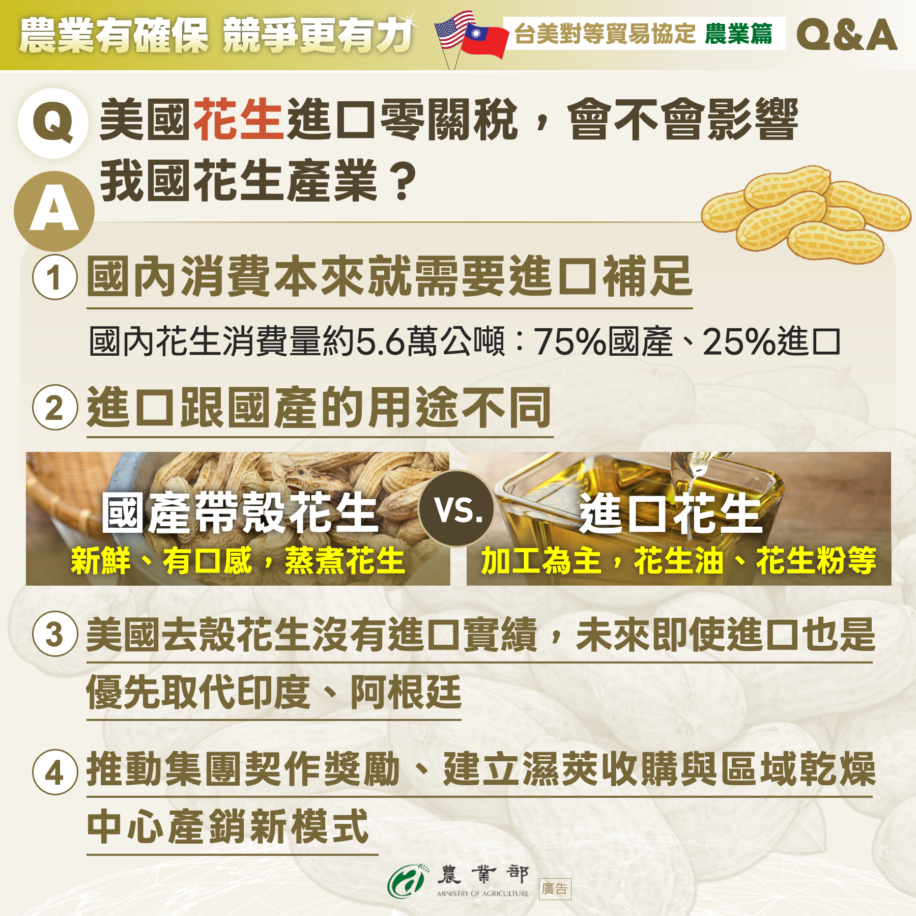 針對外界關注依據台美對等貿易協定,我方將取消美國花生進口關稅,農糧署表示,國產花生的國內市占率約75%,為因應消費需求,仍需仰賴進口,主要進口國為印度及阿根廷等;至於美國花生產品進口數量極少,且係以加工品型態輸入,並無自美國進口去殼花生實績。國產花生具有新鮮質優的在地優勢,政府除持續關注產業發展,將運用「農安基金」,與產業攜手確保國產花生競爭優勢、鞏固產業韌性,協助農民與業者穩健因應。