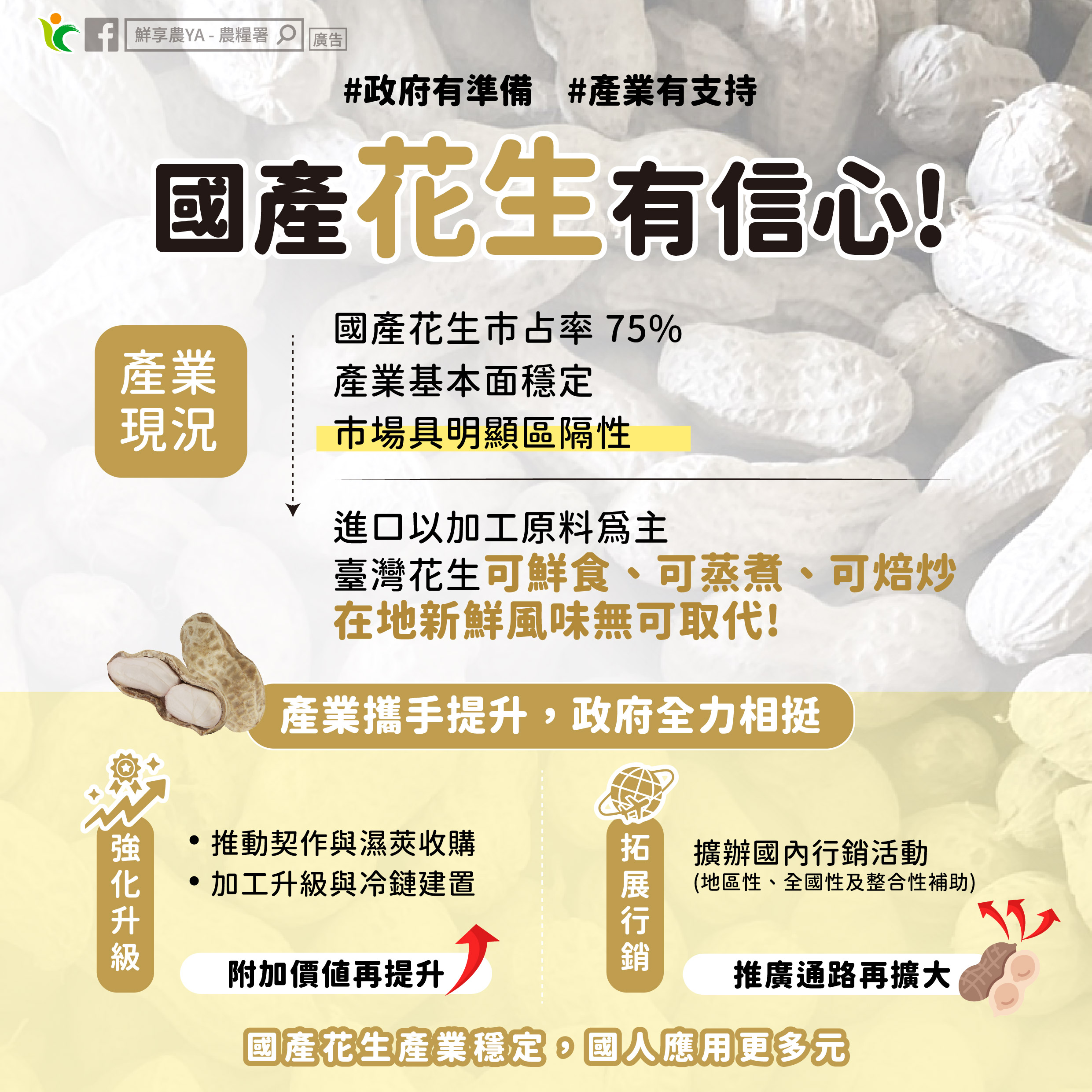 二、推動結構優化升級:引導經營主體,以契作價格確保農民收入,同時引進濕莢收購機制,以及建立區域乾燥中心,以提升國產落花生品質,確保花生加工品食品安全與產品價值。