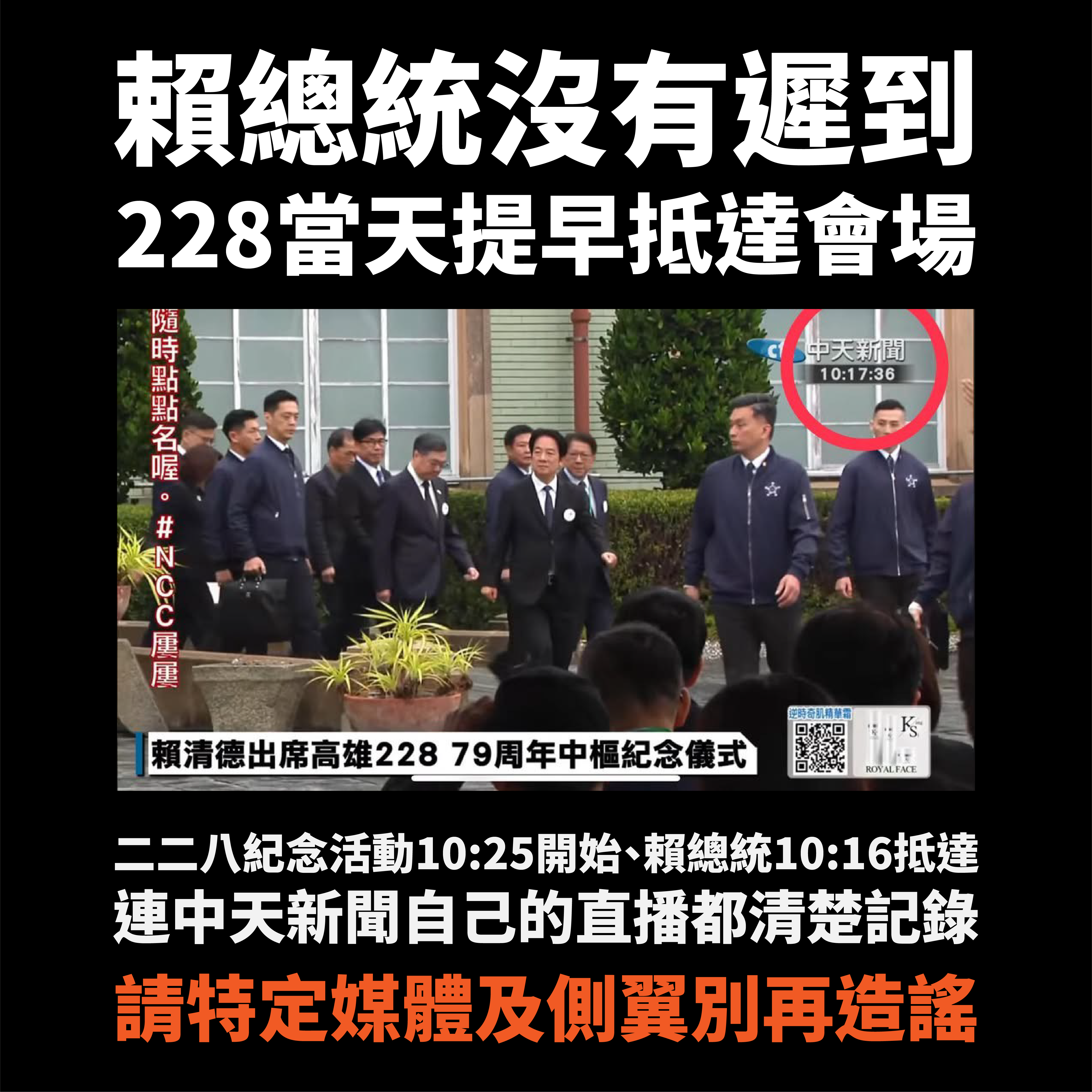 針對中天新聞報導誣指總統於2/28(六)出席高雄二二八事件79周年中樞紀念儀式遲到,致家屬枯等一小時一事,總統府發言人郭雅慧表示,該則未經查證的報導違背事實,內容憑空捏造,總統府表達嚴正譴責。實際上,儀式表定10點25分開始,總統於10點16分即提前入座,活動並全程直播,現場與會者均見證活動並無所謂總統遲到情形,也足見《中天新聞》造假惡意。