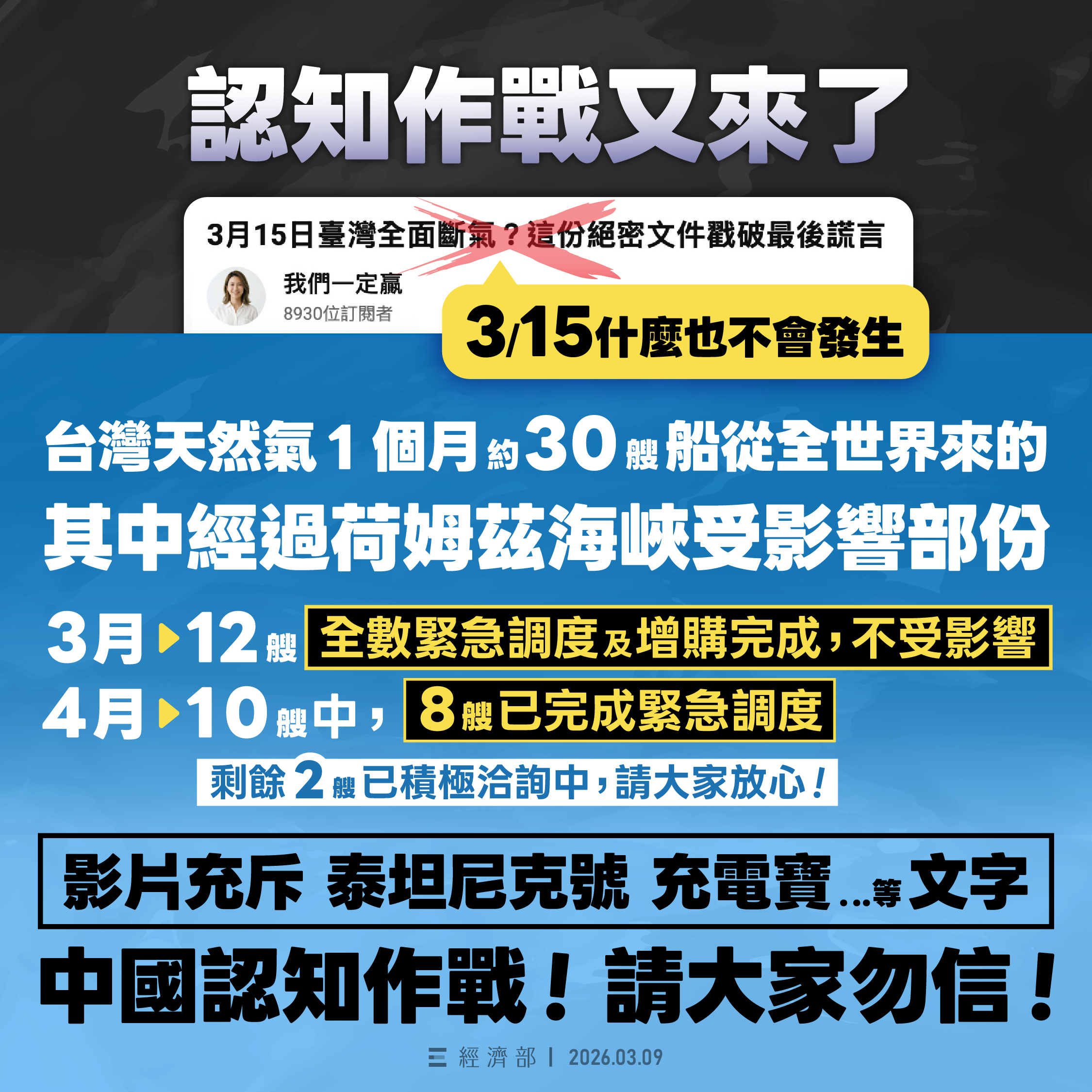 這則影片內容充斥著「泰坦尼克號」、「充電寶」文字外,中東戰事擴及全球,多個國家受影響,經濟部在第一時間,#已啟動應變小組,「來源多元分散」措施,短期「供應無虞」,長期亦有備援規劃以確保穩定供氣,並持續透過多元供應的方式,持續強化能源安全韌性。