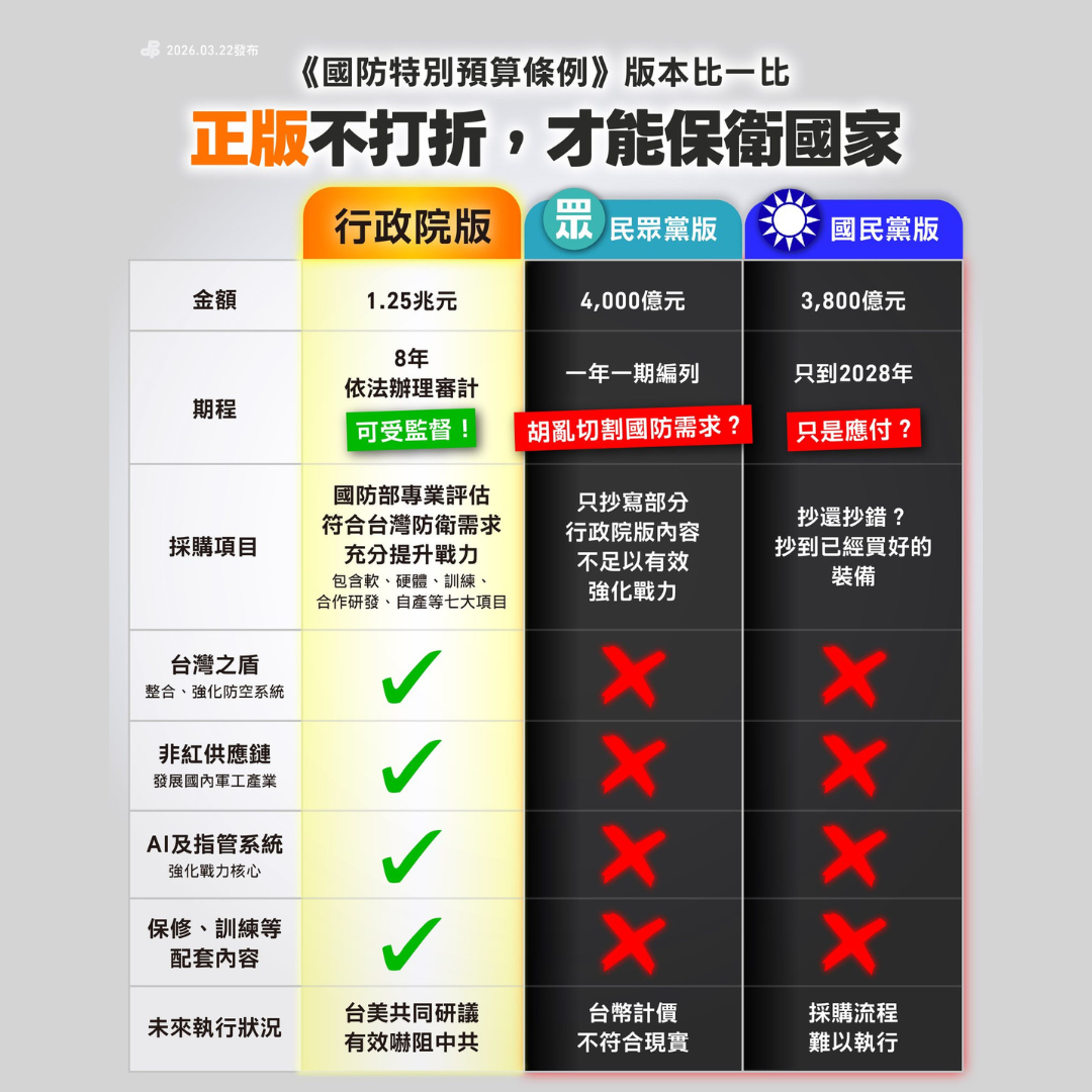 3/23(一)、3/25(三)、3/26(四)三天,在民進黨召委排案下,立法院將審查朝野各版本的 #國防特別預算條例 草案。