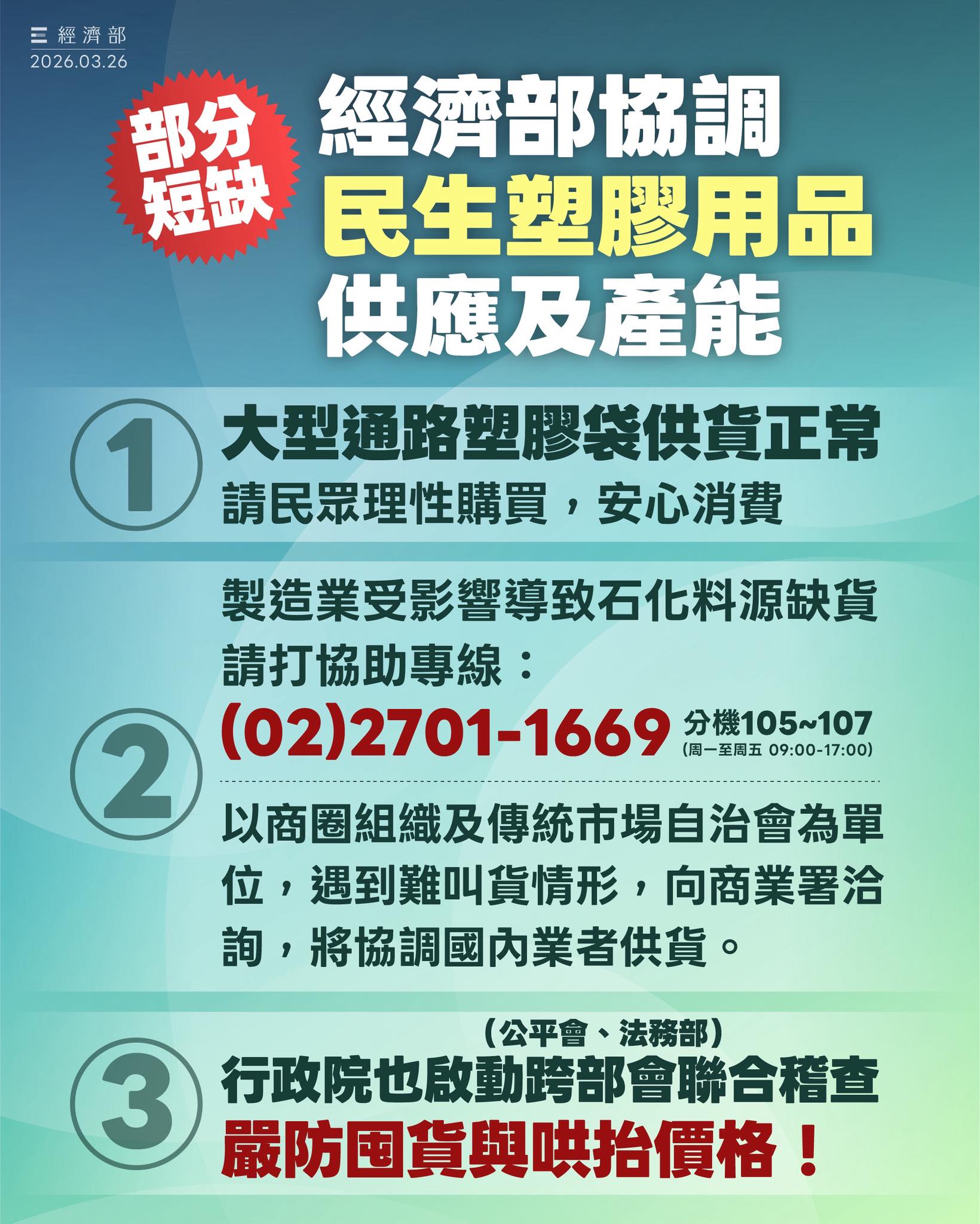 相關新聞:塑膠袋民生供應穩定 經濟部籲請民眾理性購買、安心消費
