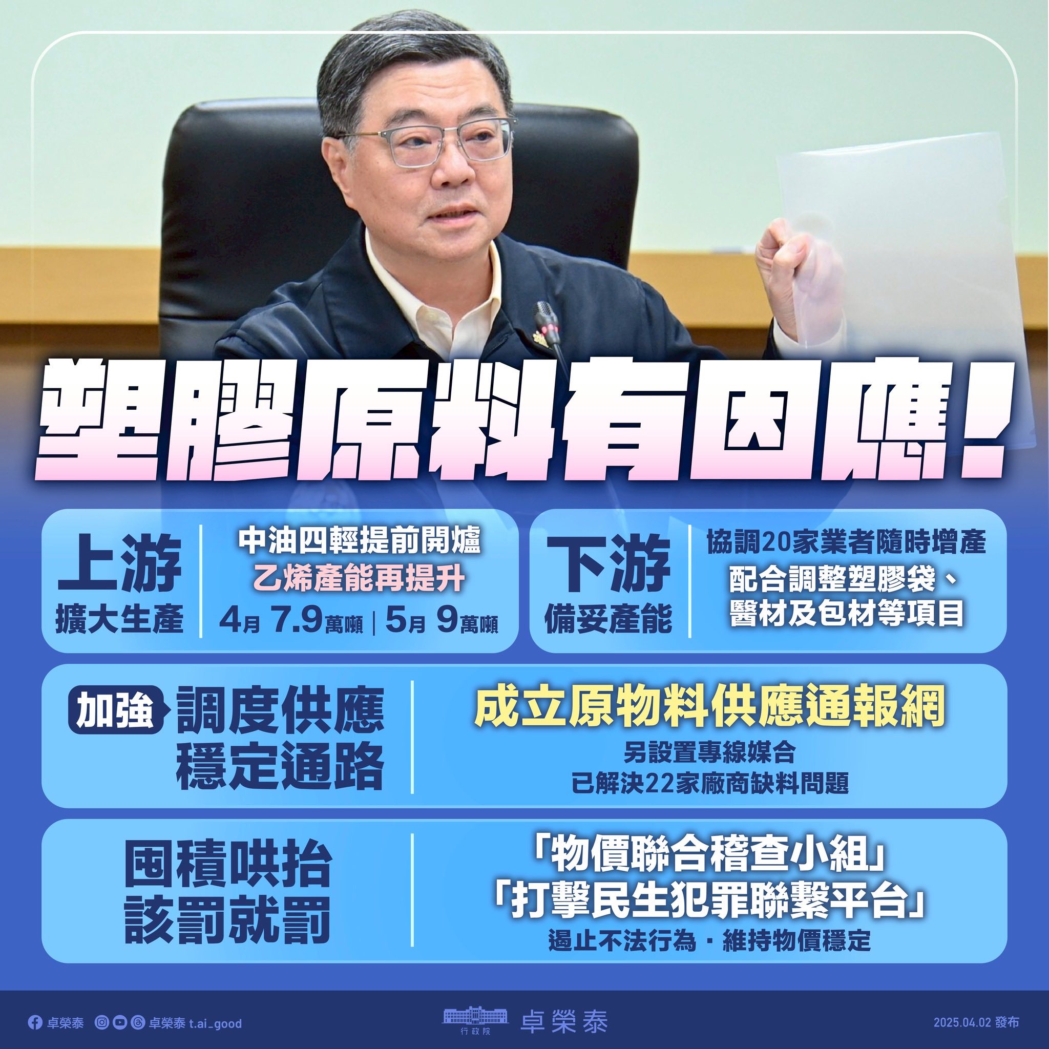 中油已擴大生產塑膠原物料(乙烯),並協調台塑化、台塑、台聚優先足量供應國內需求,並協調可生產塑膠袋、醫材、包材等塑膠製品業者隨市場動態增產或調整,確保產業鏈生產不中斷。