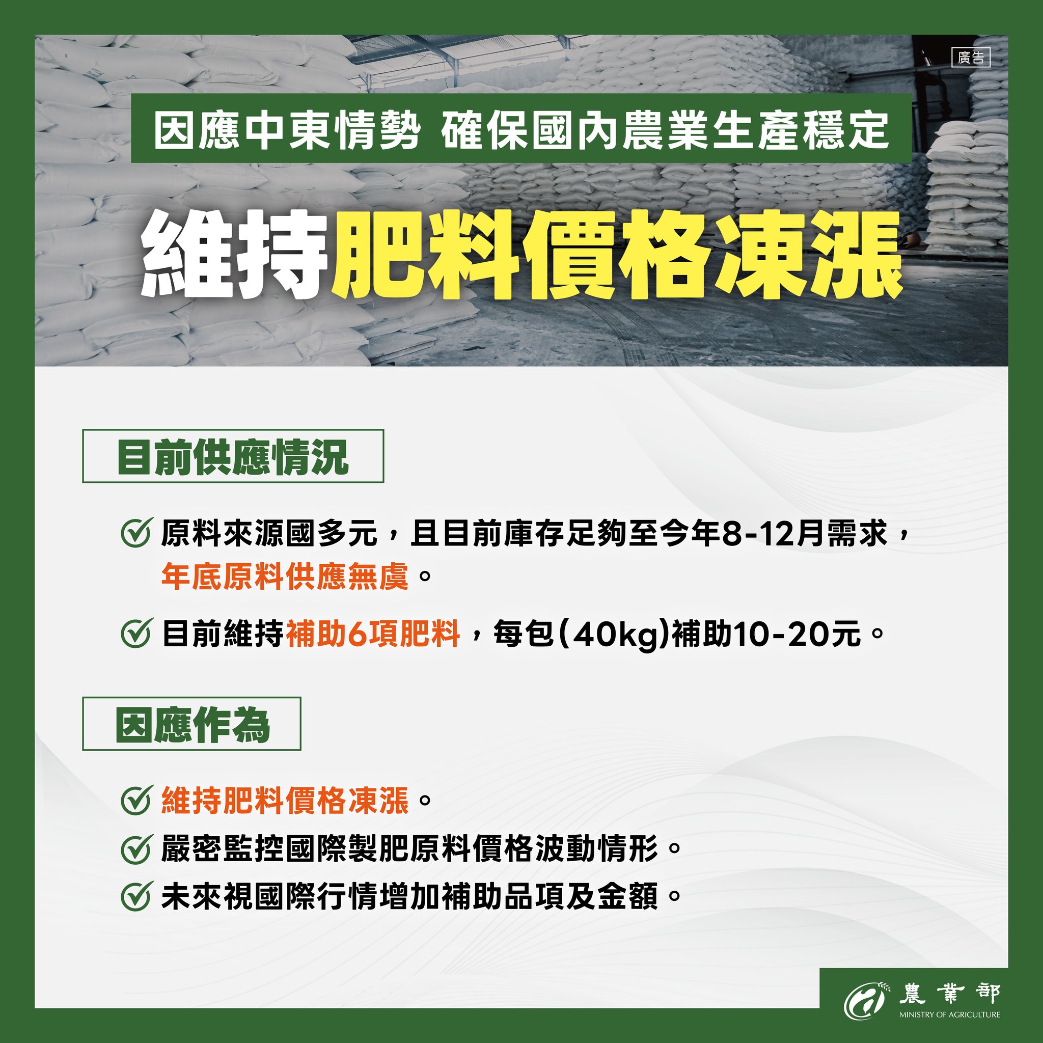 在 #肥料方面,農業部已協調台肥公司 #維持肥料價格凍漲;同時,國內肥料及原物料來源多元,目前庫存可供應至今年8至12月,下半年也已簽訂採購契約,整體供應穩定無虞。