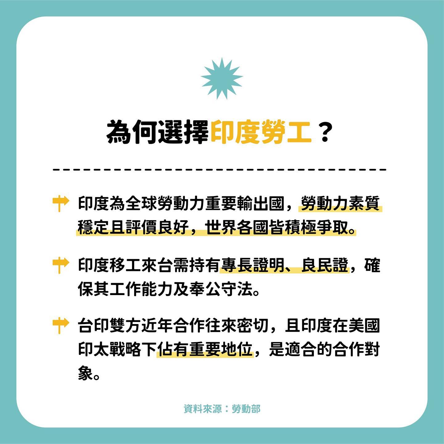 2. 針對引進印度移工,勞動部會從產業的人力需求、國人的關切與配套的完整等三方面,進行充分的評估與把關,請國人放心。