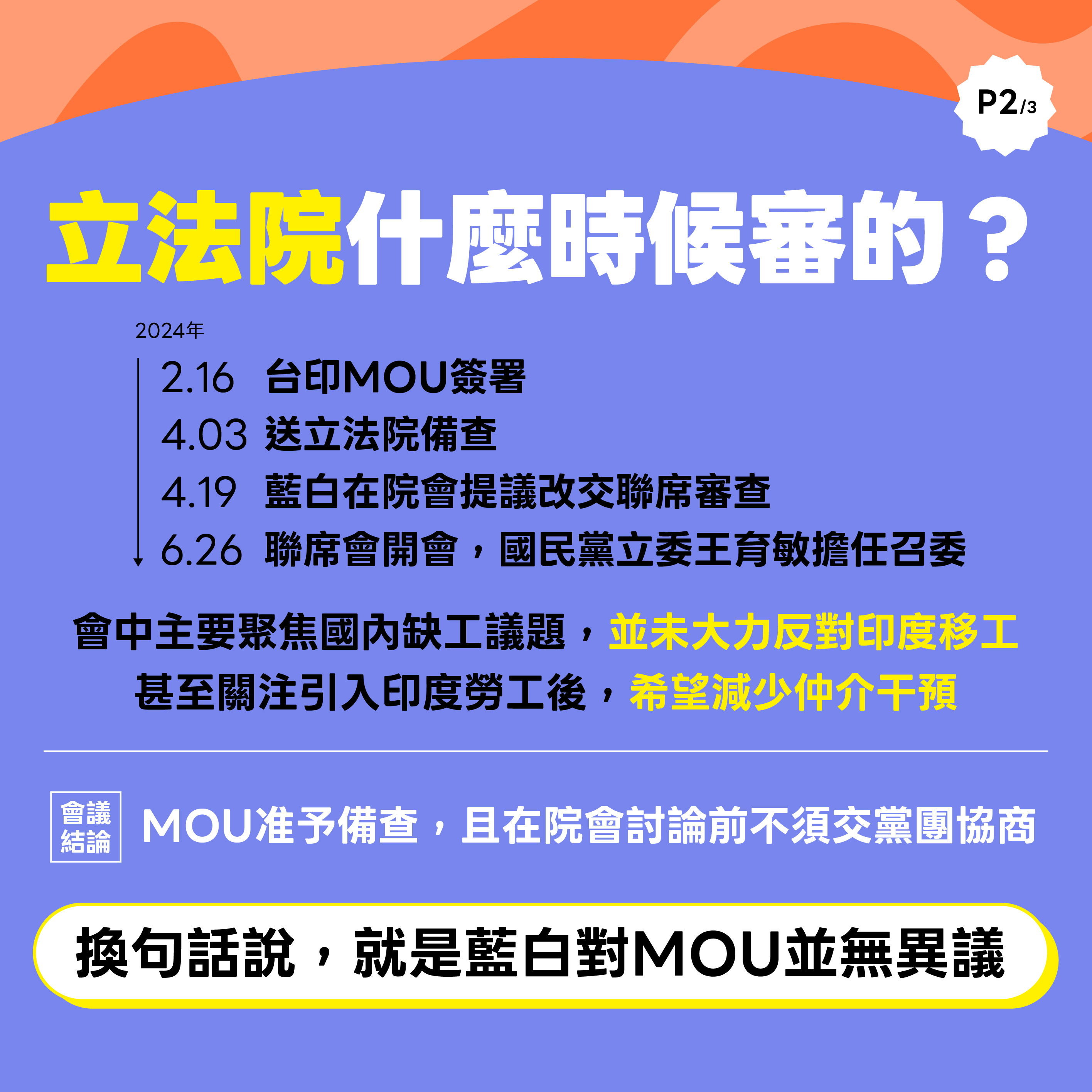 #臺印勞工MOU 在2024年二月簽署,年中送交立法院審查。當時的審查,是在不分黨派都參與且支持下通過。在這樣行政與立法的授權下,勞動部開始更進一步跟印方展開磋商。