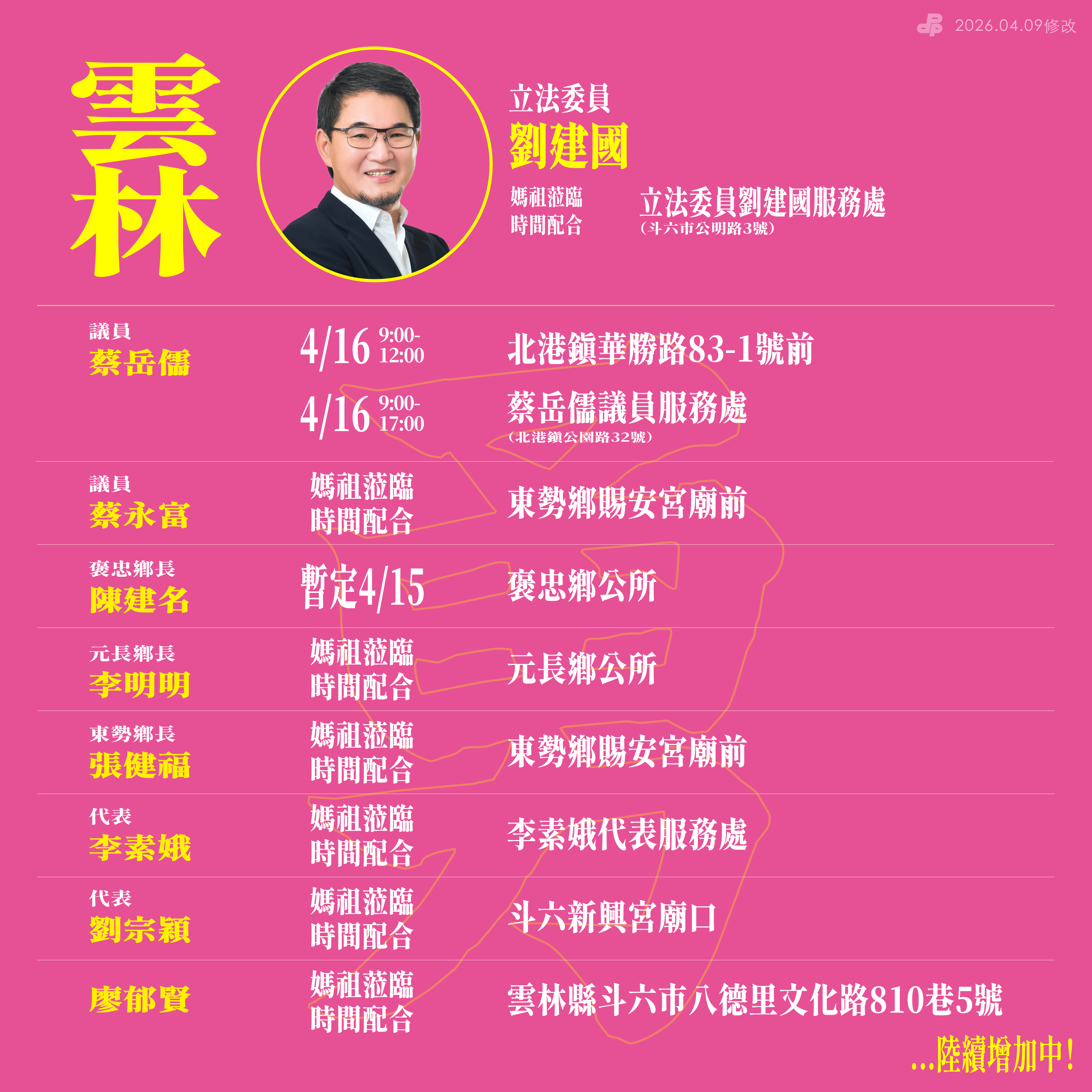 今年白沙屯媽祖往北港進香行程,將從4月12日深夜起駕。民進黨地方黨部、黨公職將提供香燈腳應援站,讓參與的香燈腳們能夠適時休憩歇腳。