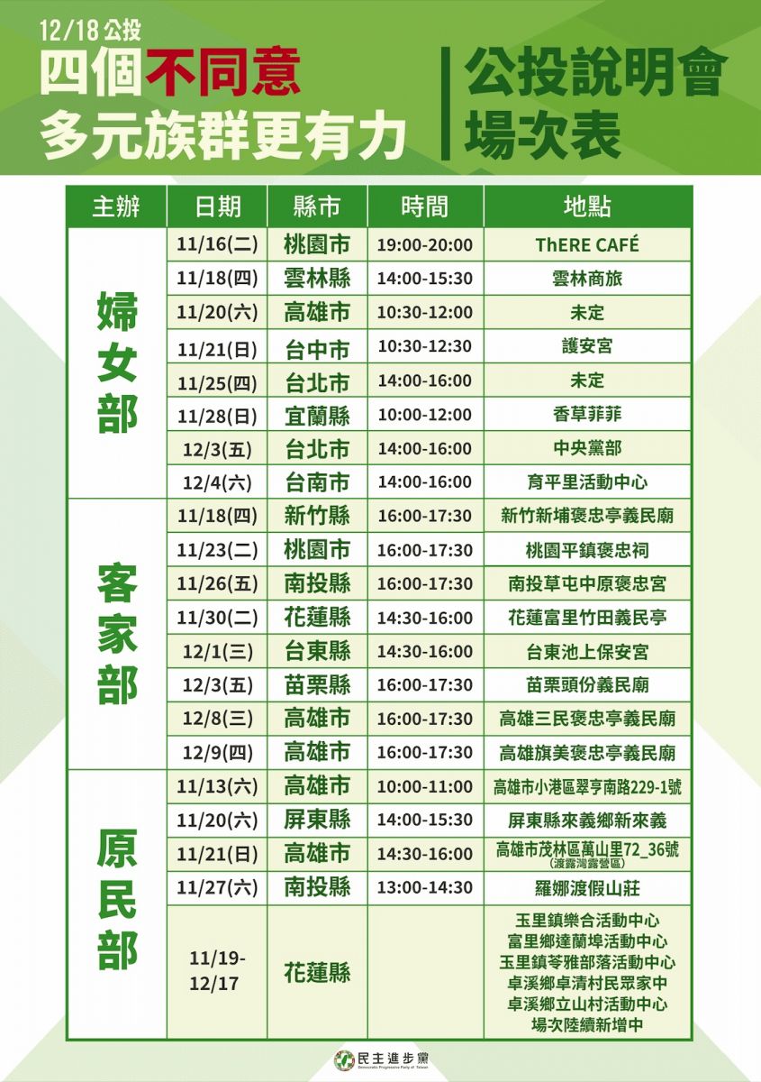 為了宣傳這次的公投,民進黨客家部、原民部及婦女部將舉辦至少25場的公投說明會,客家部預計在各地義民廟前舉辦說明會;原民部則是將走入原鄉;另外,婦女部也積極邀請各地的新住民團體以及婦女團體共同舉辦,呼籲各族群站出來投下四個不同意票,捍衛臺灣的未來。