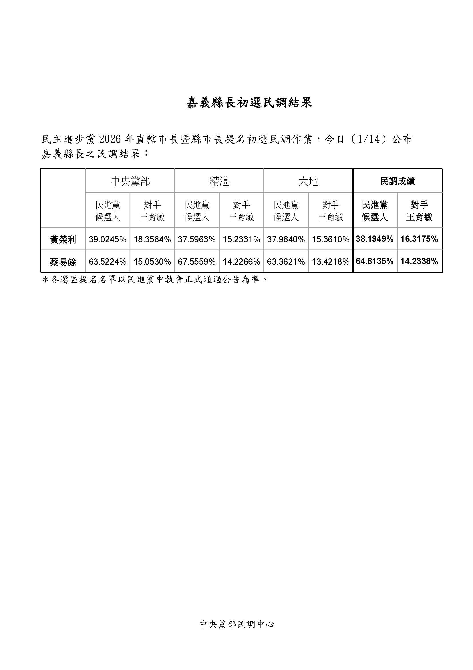 嘉義縣之民調結果,如下表所示: