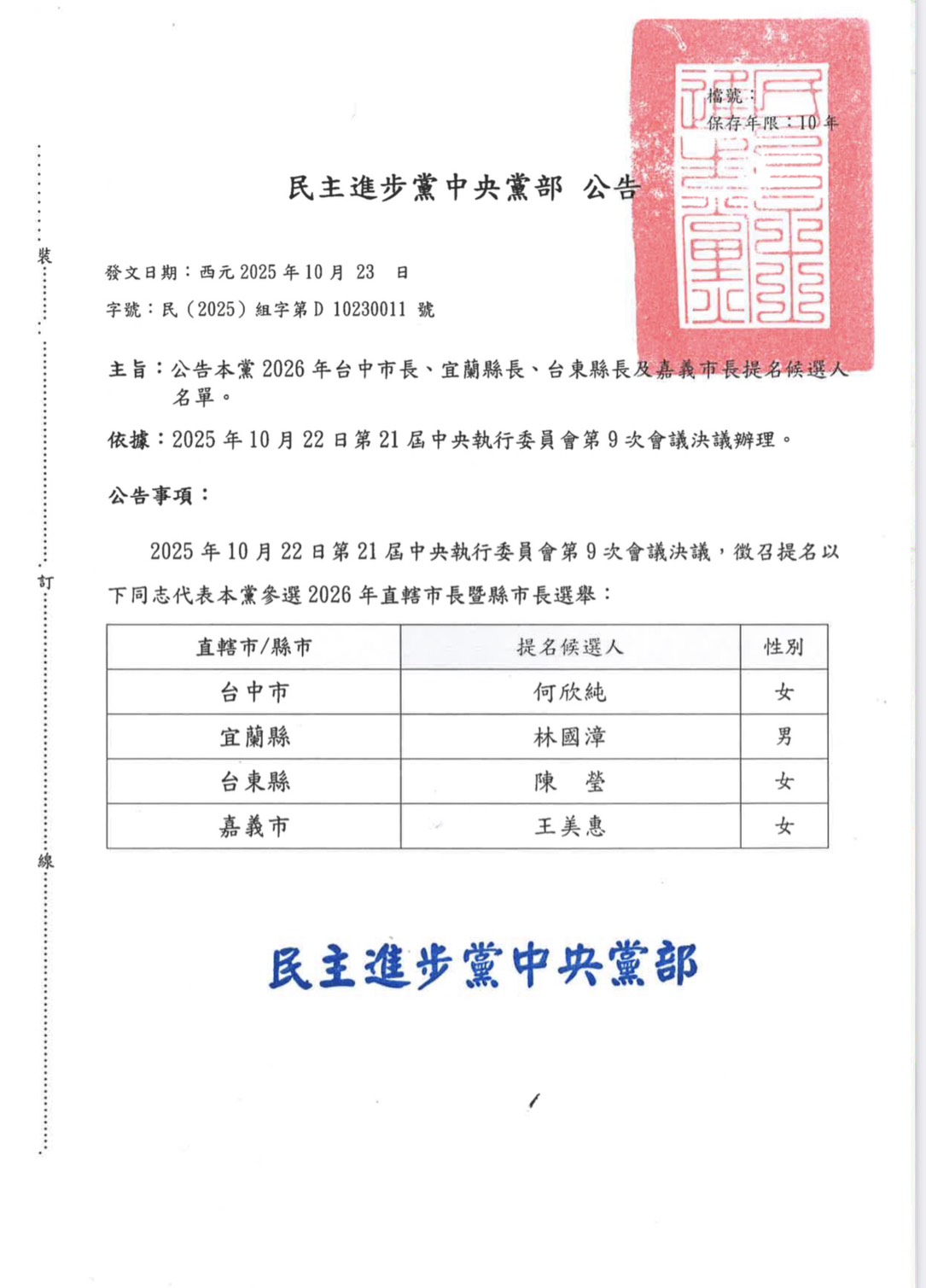 公告2026年台中市長、宜蘭縣長、台東縣長、嘉義市長提名候選人名單。