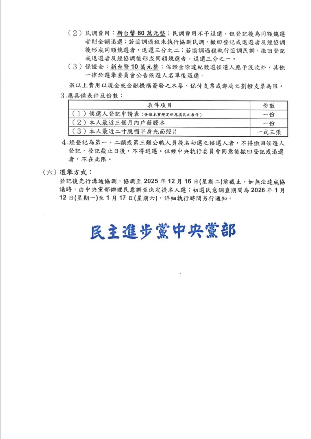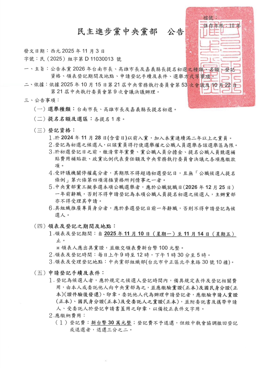 檔案下載:民(2025)組字第D11030013號-台南市長+高雄市長+嘉義縣長提名初選選舉公告.pdf